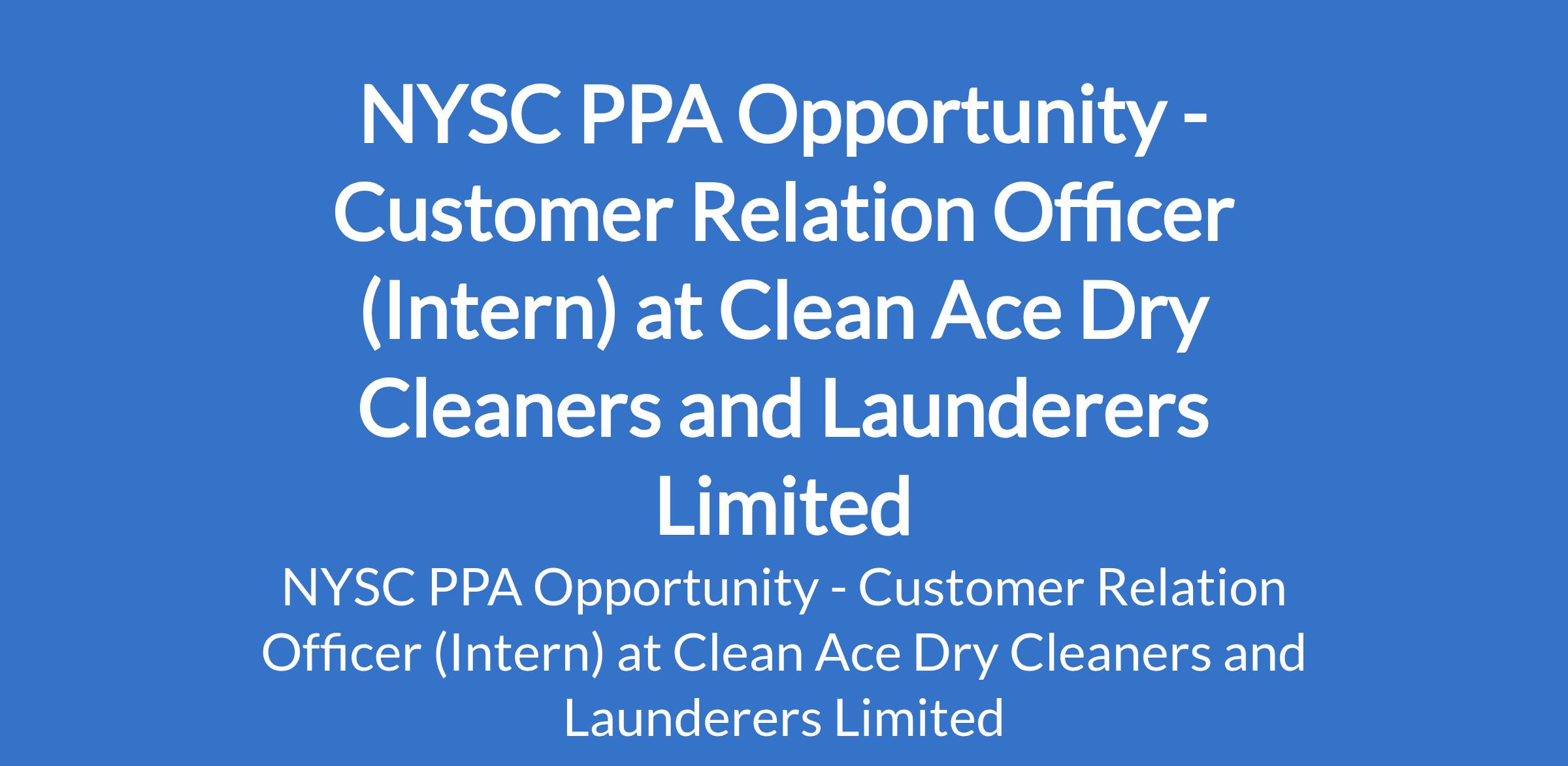 Clean Ace Dry Cleaners and Launderers Limited is recruiting to fill the position of: NYSC PPA Opportunity - Customer Relation Officer (Intern). The position is located in Lekki, Lagos State. Salary: N70,000 / month. Interested candidates should possess relevant qualifications and should live in close proximity to Lekki.