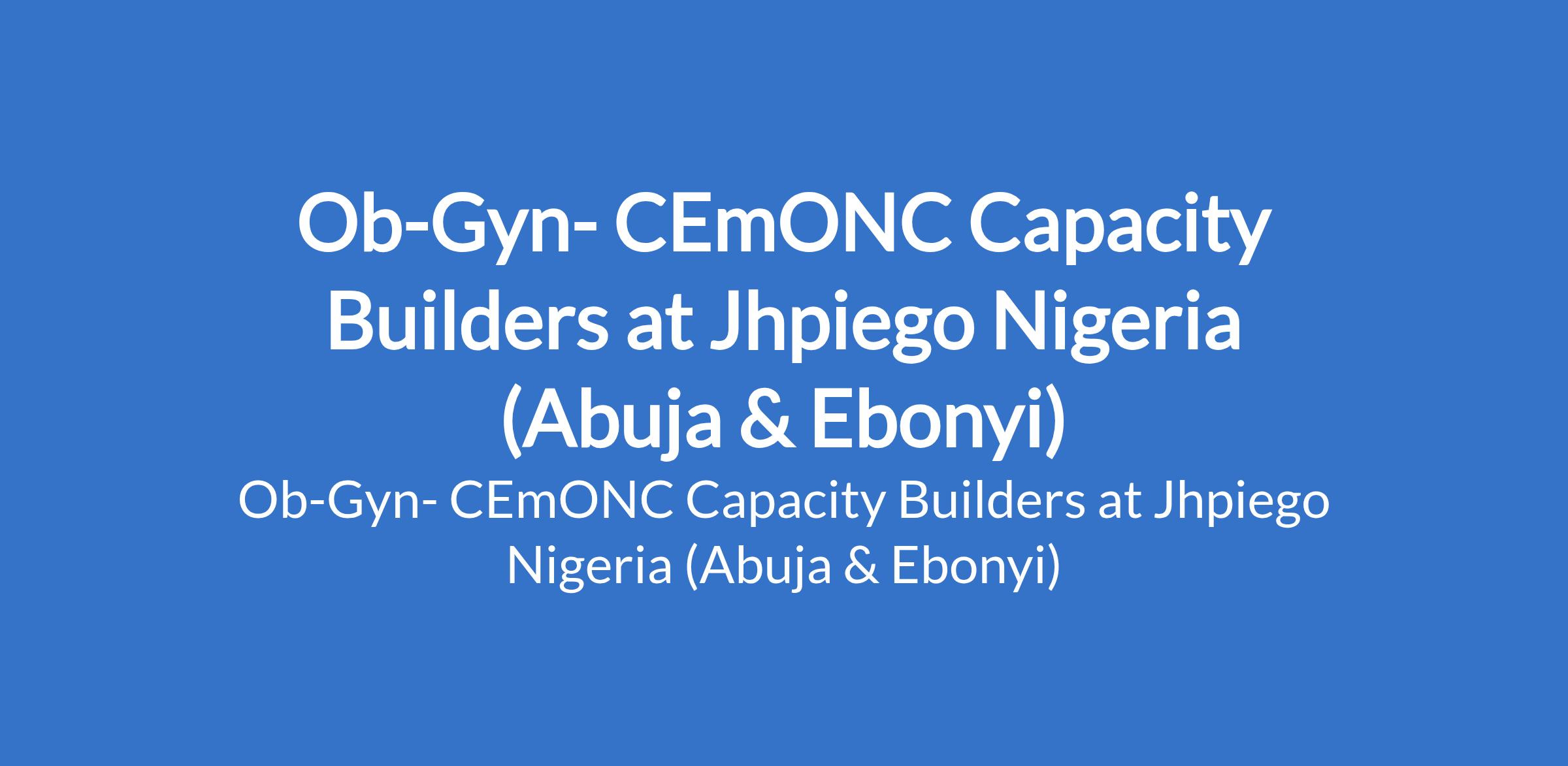 Jhpiego Nigeria is recruiting to fill the position of: Ob-Gyn- CEmONC Capacity Builder. The position is located in Abuja and Abakaliki - Ebonyi State. Interested candidates must be a Registered and practicing Obstetrician/Gynaecologist with evidence of previous and ongoing work experience in a facility delivering CEmONC services.