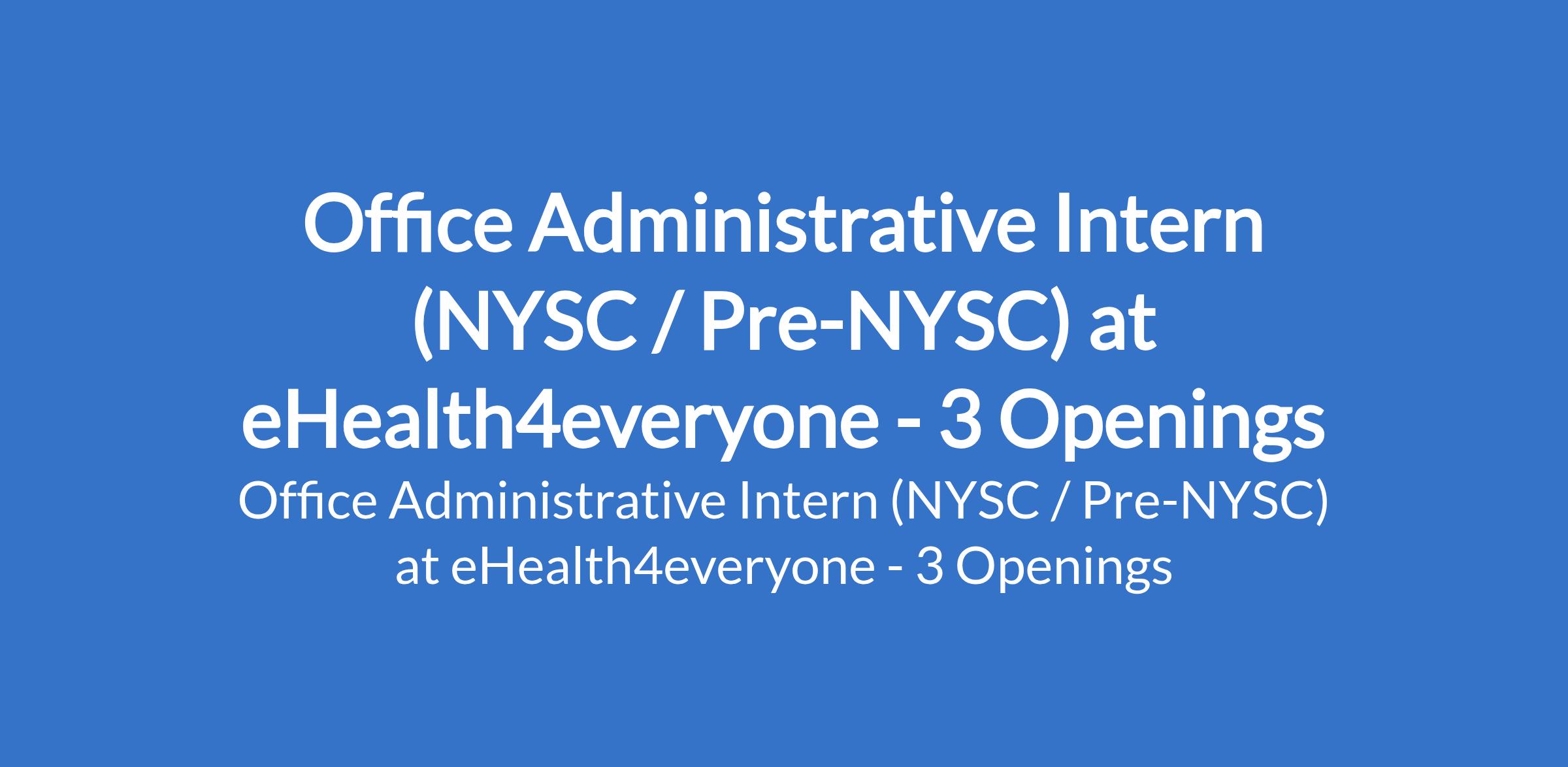 eHealth4everyone is recruiting to fill the position of: Office Administrative Intern (NYSC/Pre-NYSC). The position is located in Abuja (FCT), Lagos, Oyo States. Interested candidates should possess a Bachelors Degree in Business Administration, Management or related field with a minimum of Six (6) Months experience in a related role.