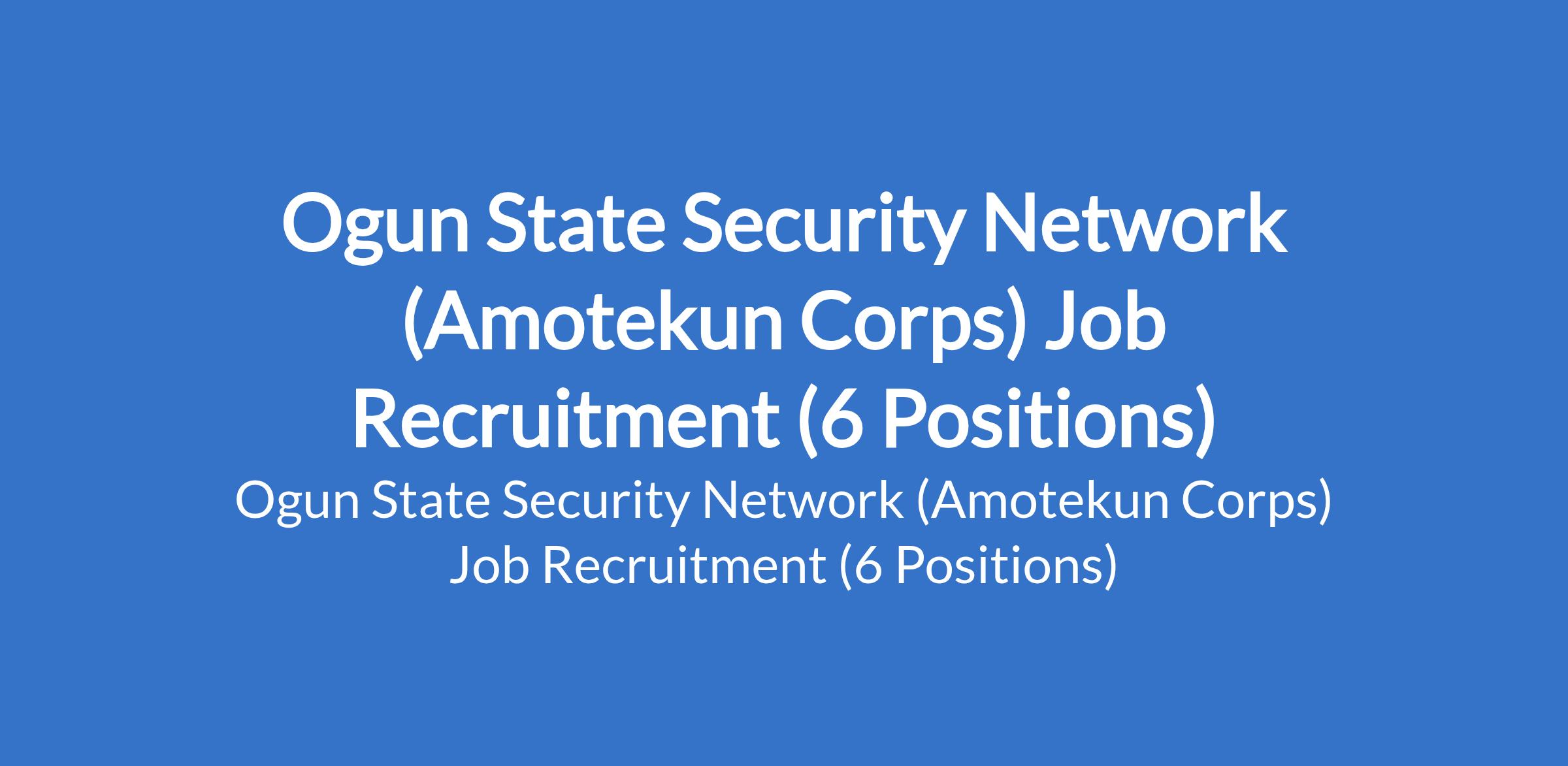 Ogun State Security Network (Amotekun Corps) invites applications from suitably qualified candidates to fill the following positions: Corps Field Officer, Superintendent of Corps, Assistant Superintendent of Corps I, Assistant Superintendent of Corps II, Senior Corps Assistant, and Corps Field Operative.