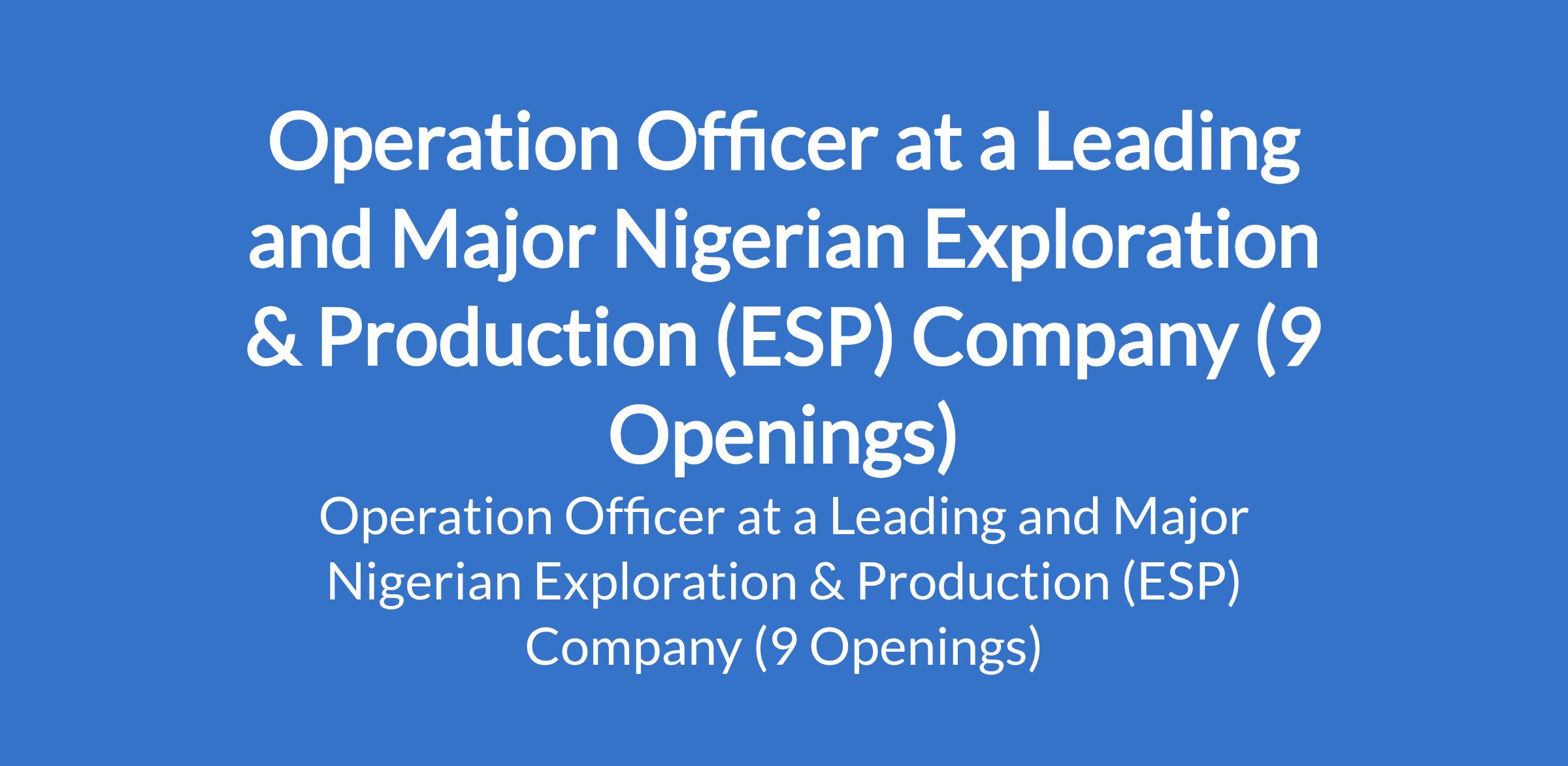 A leading and major Nigerian Exploration & Production (ESP) Company is recruiting to fill the position of: Operation Officer. The position is located in Abia, Akwa Ibom, Bayelsa, Cross River, Delta, Edo, Imo, Ondo, and Rivers States. Interested candidates should possess a minimum of Bachelor Degree in Business Administration or Social Sciences with a minimum of Second Class Upper division with a minimum of ten (10) years of relevant experience in an E&P company.