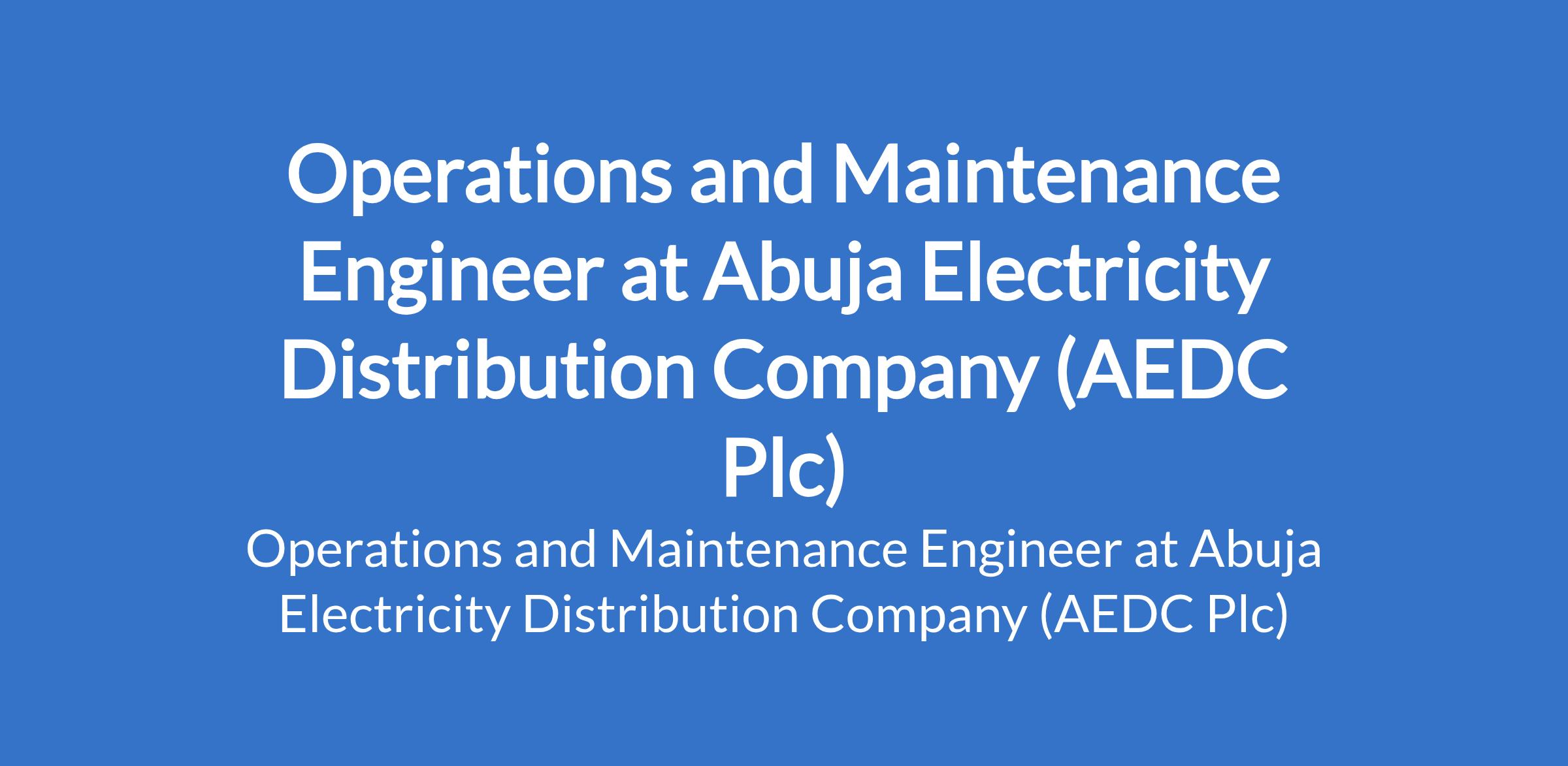 Abuja Electricity Distribution Company (AEDC Plc) is recruiting to fill the position of: Operations and Maintenance Engineer. The ideal candidate will be responsible for the safe, reliable, and efficient operation of the electricity distribution network across AEDCs franchise area.
