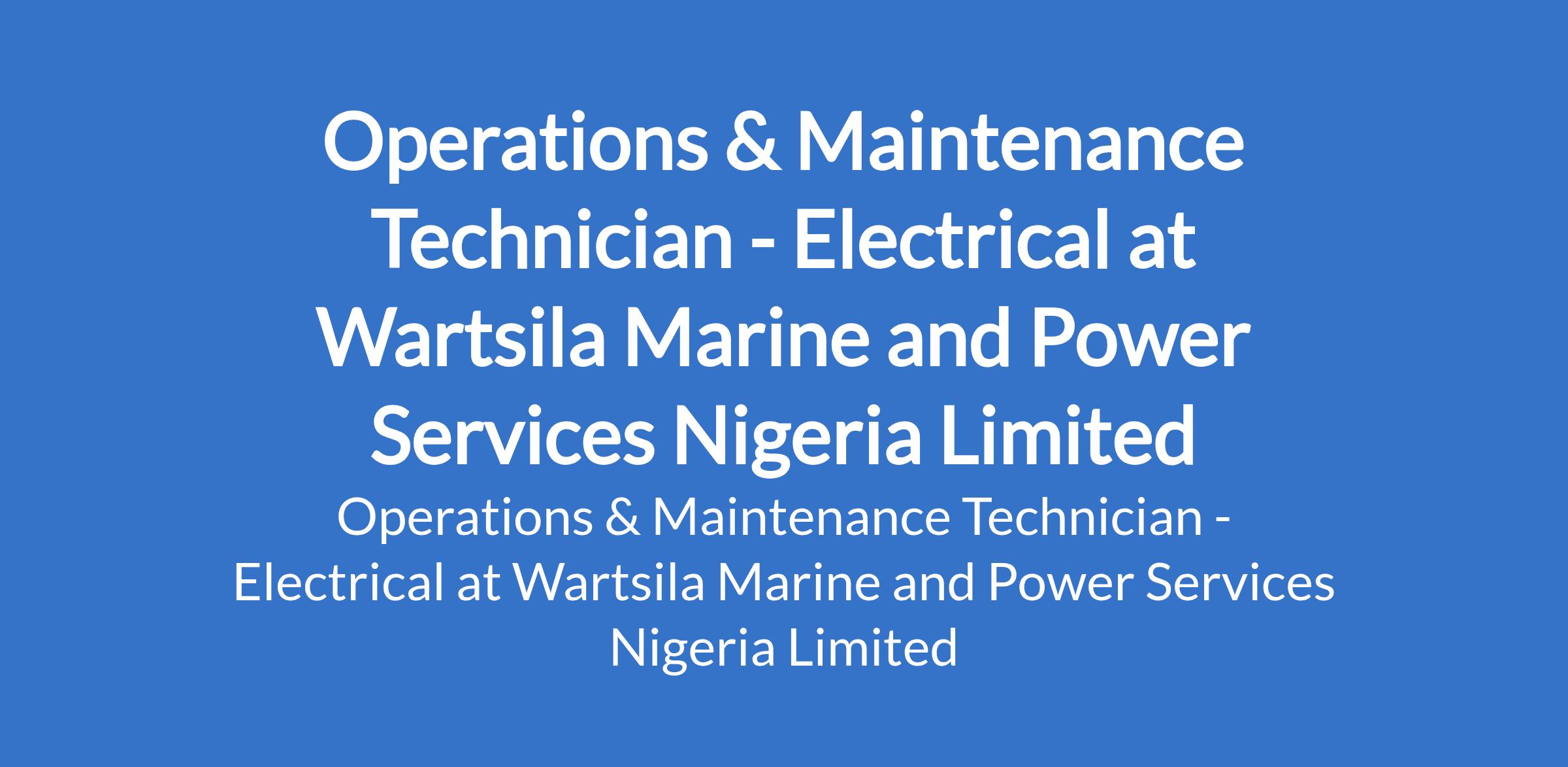 Wartsila Marine and Power Services Nigeria Limited is recruiting to fill the position of: Operations & Maintenance Technician - Electrical. The position is located in Kogi State. Interested candidates should possess a Higher National Diploma (HND) or a Degree in Engineering (B.Eng.) or Technology (B.Tech) in Electrical with 3-5 years of relevant work experience in Wartsila DF Engine.