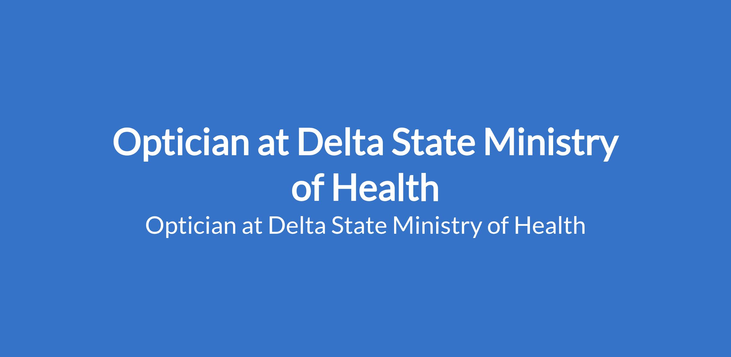Delta State Ministry of Health is inviting applications from suitable candidates to fill the position of: Optician. Interested candidates should possess a National Diploma or Higher National Diploma in dispensing optics or a closely related field from a recognized school of health of technology or accredited institution.
