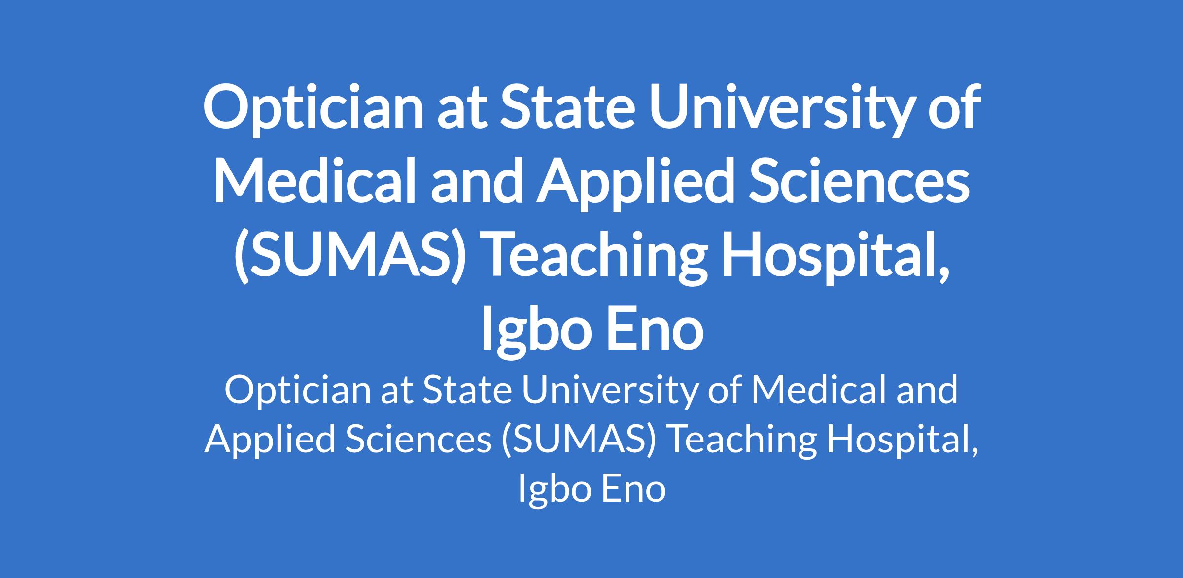 State University of Medical and Applied Sciences (SUMAS) Teaching Hospital, Igbo Eno invites applications from suitable candidates for the position of: Optician. The position is located in Enugu State. Interested candidates should possess relevant qualifications with a 3-year training programme at the School of Health Technology and obtain the registration of the Institute of Laboratory Technology of Nigeria for the Technician cadre.