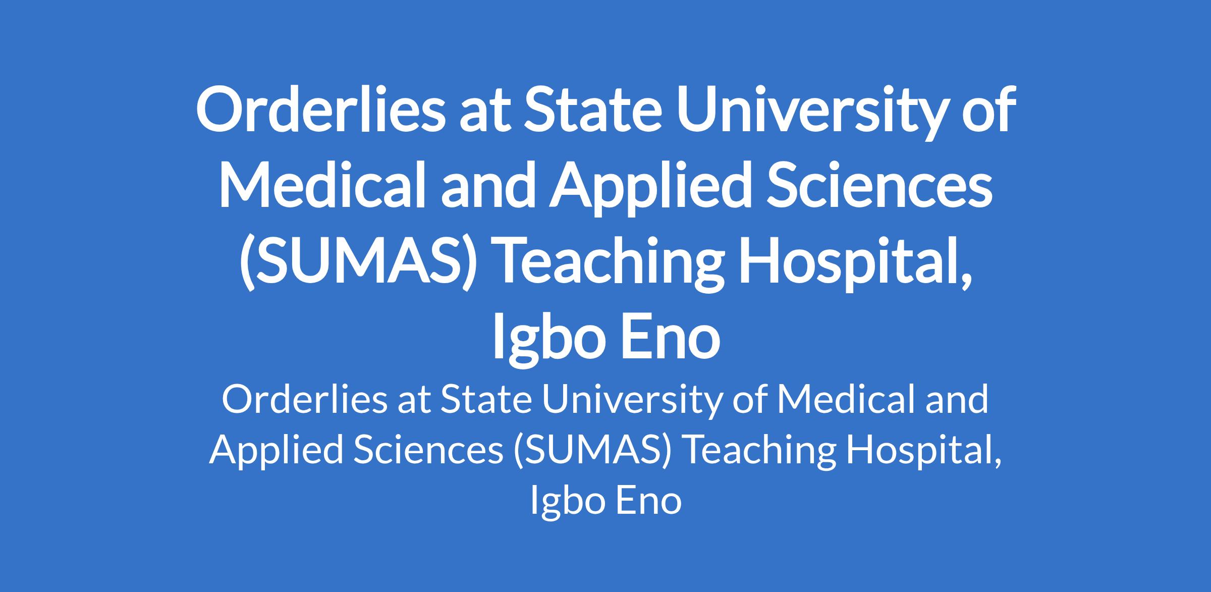 State University of Medical and Applied Sciences (SUMAS) Teaching Hospital, Igbo Eno invites applications from suitable candidates for the position of: Orderly. The position is located in Enugu State. Interested candidates should possess a First School Leaving Certificate, and a Junior Secondary Certificate will be an added advantage.
