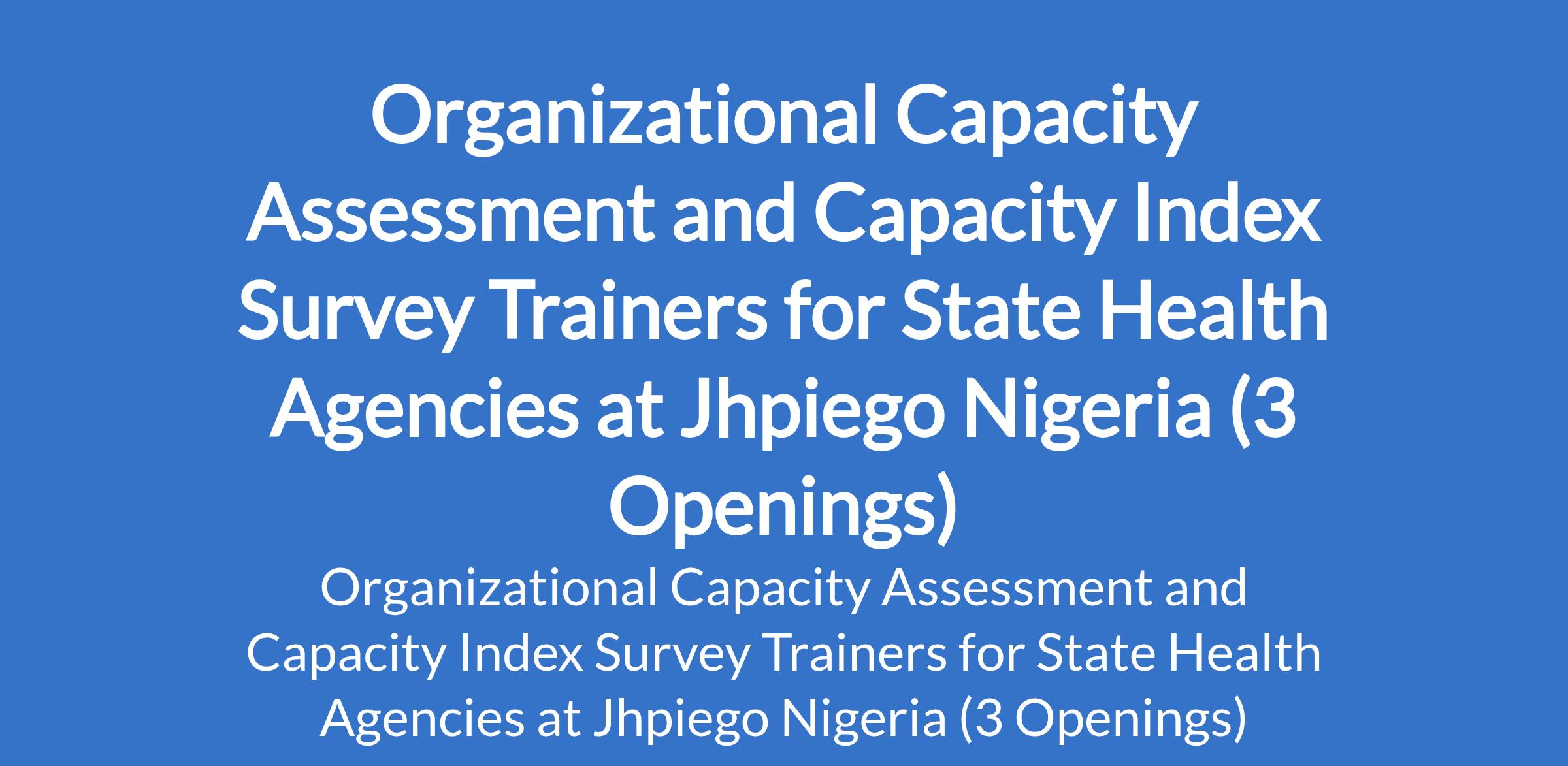 Jhpiego Nigeria is recruiting to fill the position of: Organizational Capacity Assessment and Capacity Index Survey Trainer for State Health Agencies. The position is located in Abuja, Birnin Kebbi - Kebbi, and Abakaliki - Ebonyi States. Interested candidates should possess an Advanced Degree in Public Health, Health Policy, Organizational Development, Governance, or related fields with at least 10 years of professional experience in organizational capacity assessments, institutional strengthening, or governance reform.