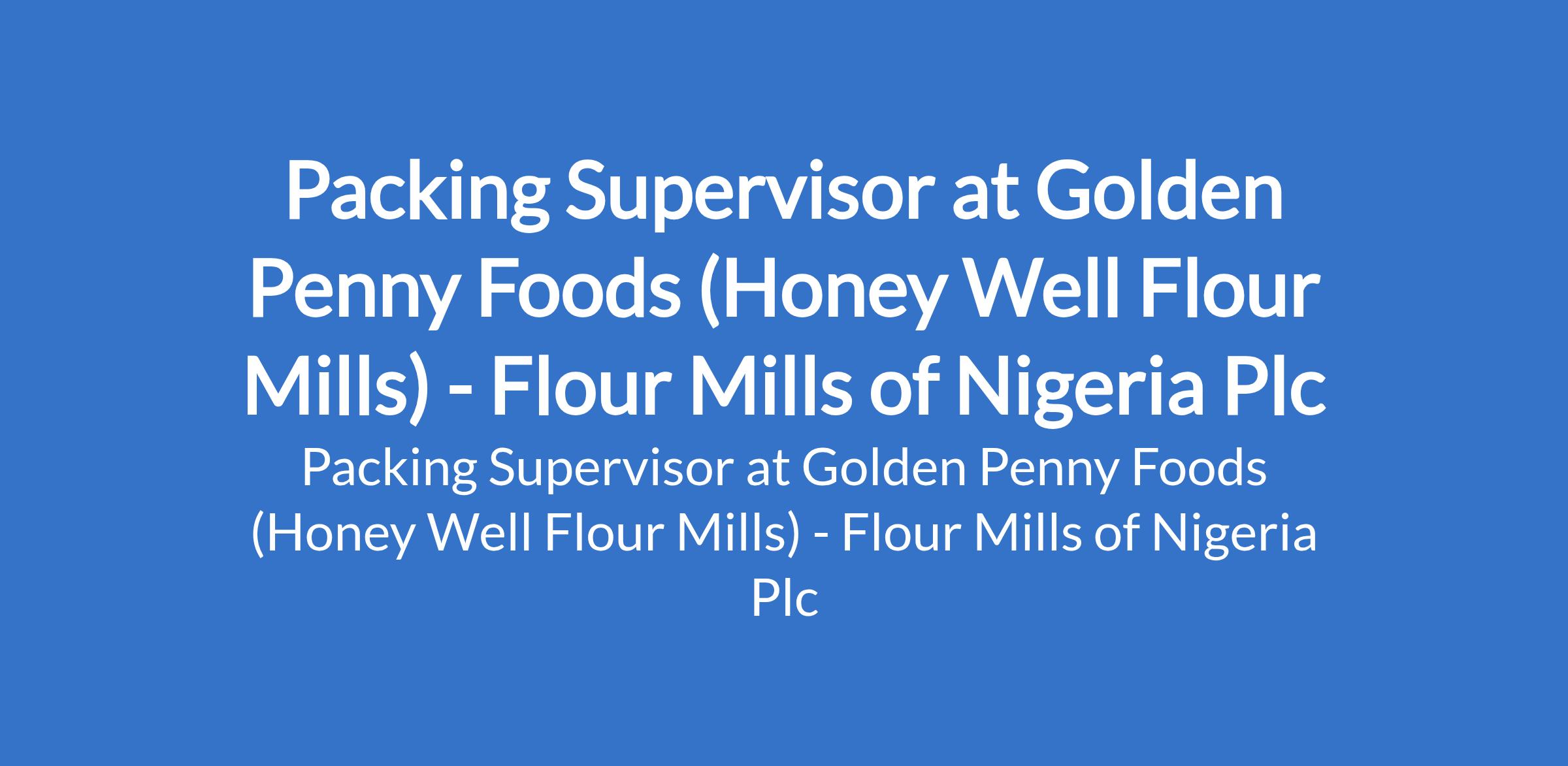 Golden Penny Foods (Honey Well Flour Mills), a subsidiary of Flour Mills of Nigeria Plc is recruiting to fill the position of: Packing Supervisor. The position is located in Sagamu, Ogun State. Interested candidates should possess 5 OLevel credits, including Mathematics and English, and an OND qualification in Engineering or any Sciencerelated discipline, with a minimum of two years experience in a similar role or related industry, preferably within a manufacturing or FMCG environment.