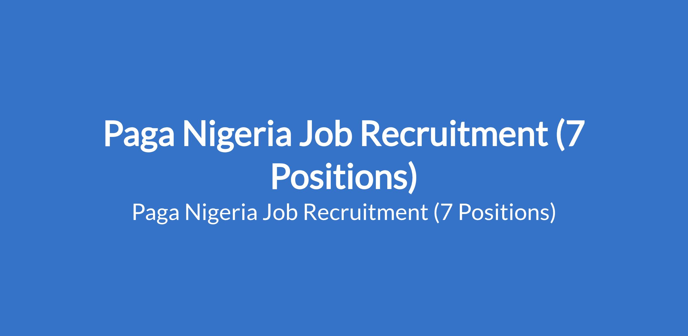 Paga Nigeria is recruiting suitable candidates to fill the following positions in Lagos State: Key Account Manager; Head, Internal Audit; Senior Key Account Manager; Sales Manager; Senior Sales Executive; Sales Executive; and Strategic Partnership Executive.