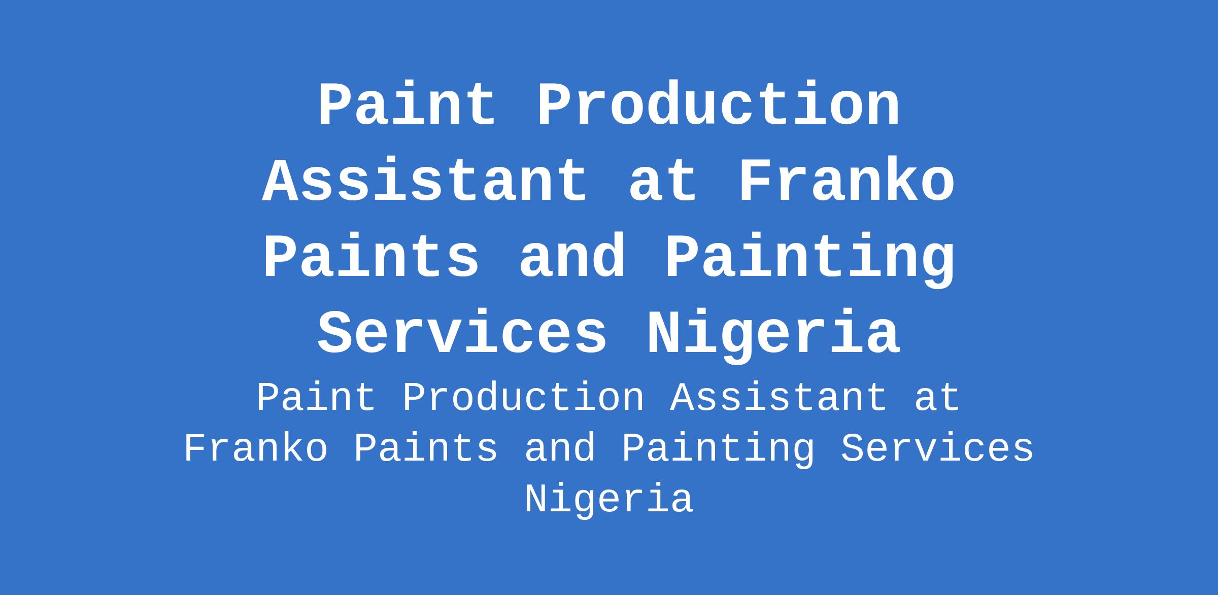 Franko Paints and Painting Services Nigeria is recruiting to fill the position of: Paint Production Assistant. The position is located in Orlu / Umuaka, Imo State. Salary: N70,000 - N120,000 / month. Interested candidates should possess an HND / NCE / OND / SSCE with 1 - 5 years experience.
