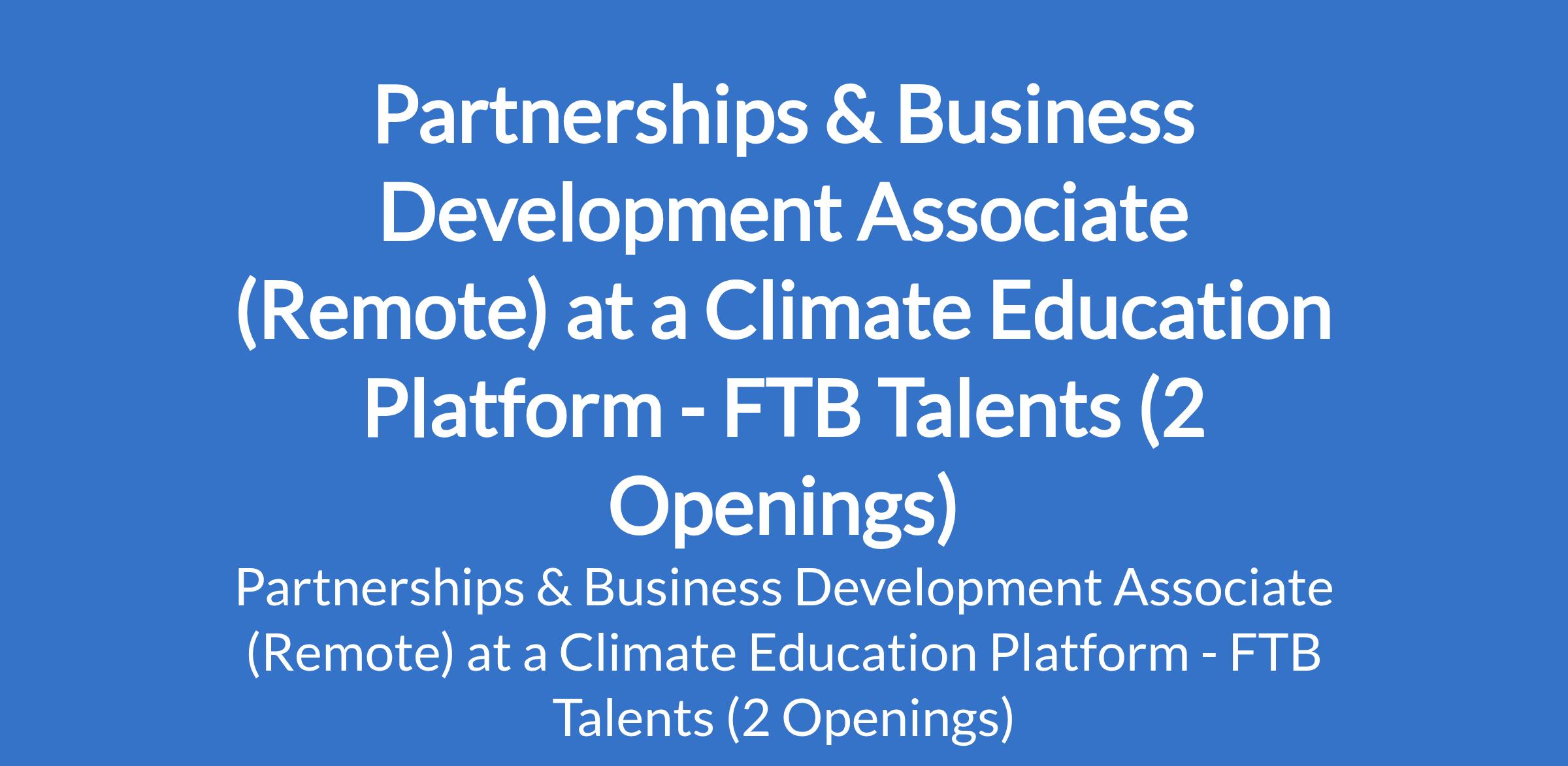 FTB Talents - Our client, a climate education platform is recruiting to fill the position of: Partnerships & Business Development Associate. The position is located in Abuja (FCT) and Lagos State. Interested candidates should possess relevant qualifications with 23 years experience in partnerships, sales, business development, or a related role.