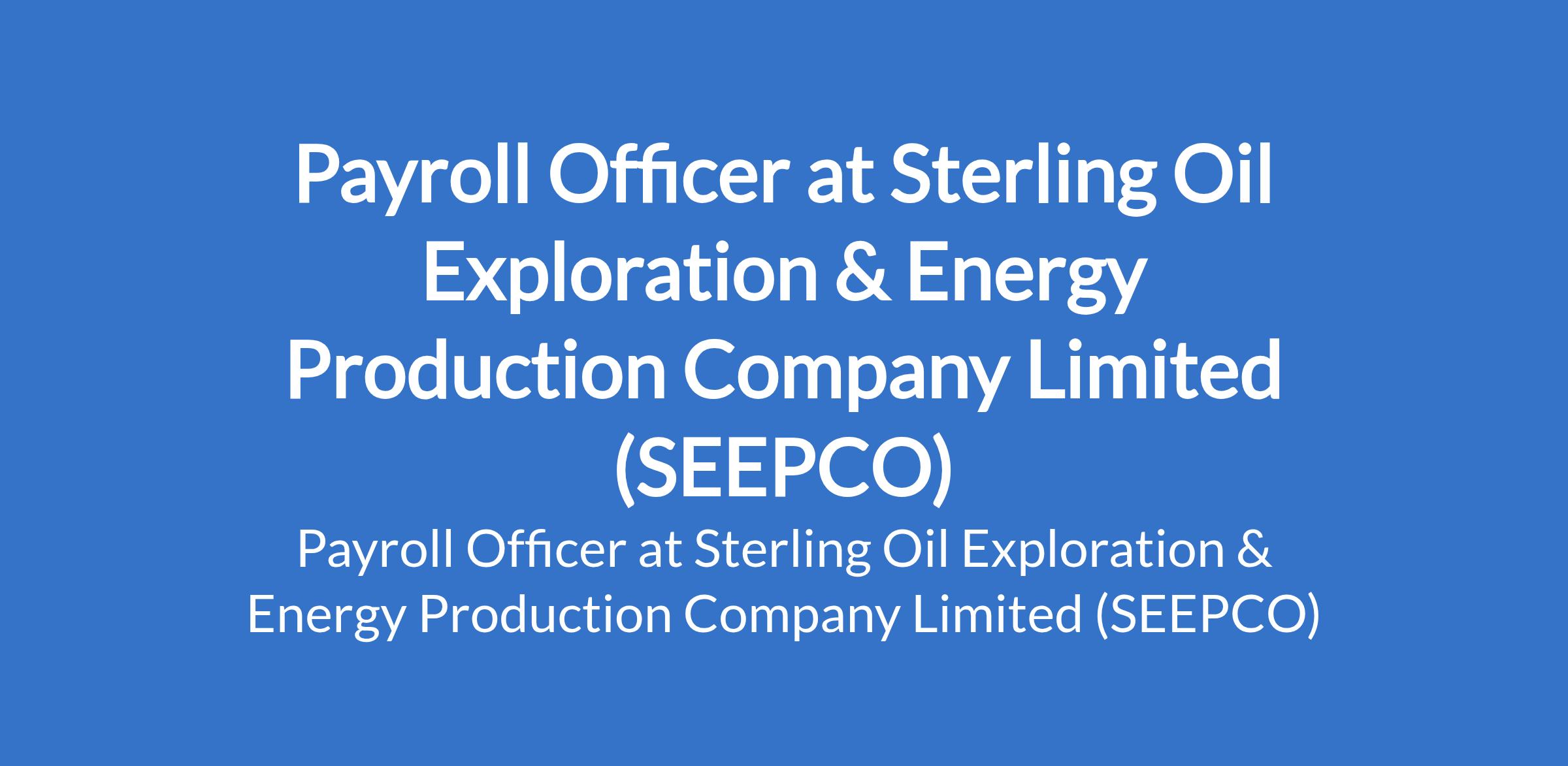 Sterling Oil Exploration & Energy Production Company Limited (SEEPCO) is recruiting to fill the position of: Payroll Officer. The position is located in VI, Lagos State. Interested candidates should possess a Bachelors Degree in Human Resources, Accounting, Finance, Business Administration, or related fields with proven experience as a Payroll Officer or similar role.