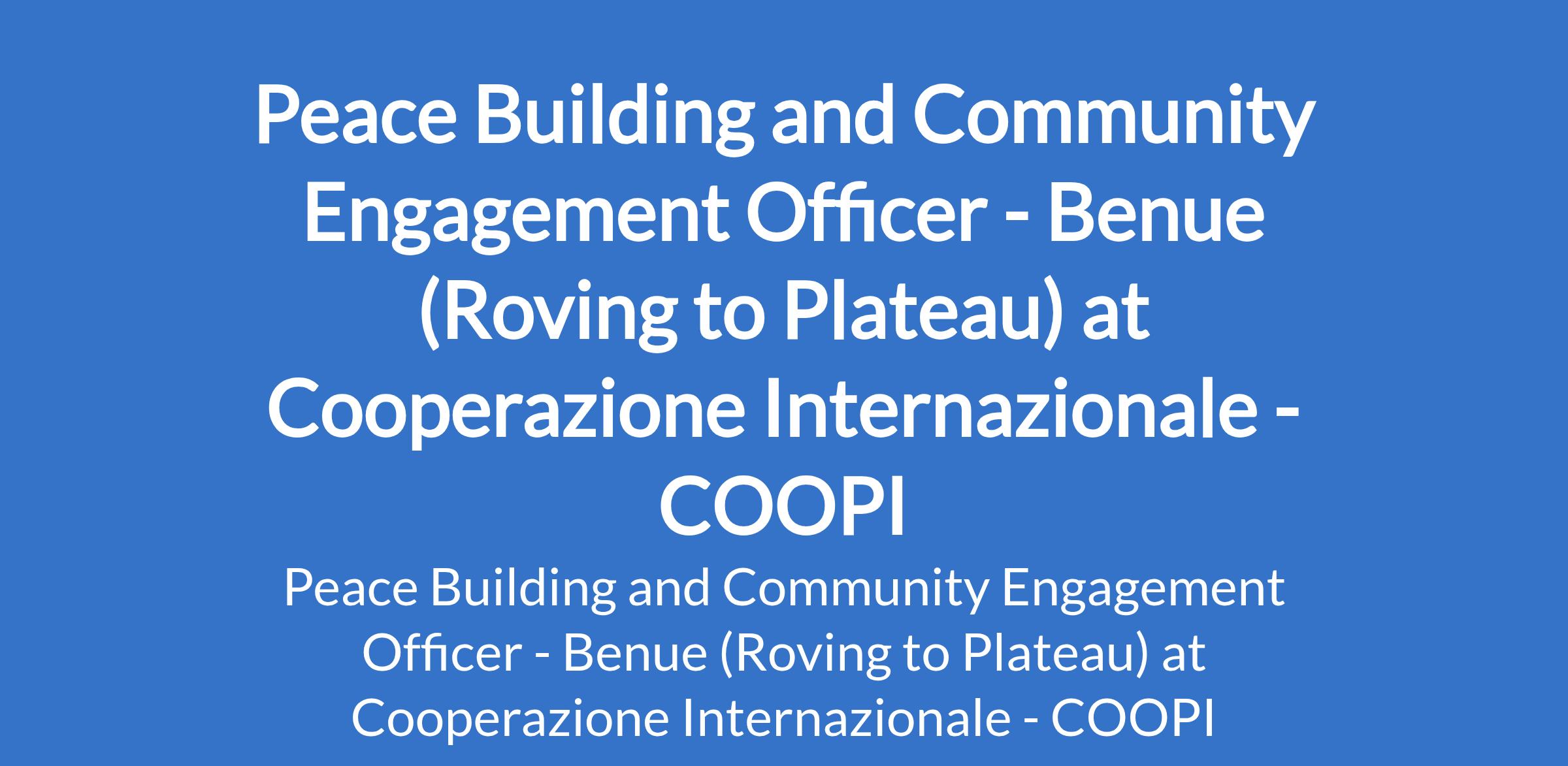 Cooperazione Internazionale - COOPI is recruiting to fill the position of: Peace Building and Community Engagement Officer. The position is located in Benue State (Roving to Plateau). Interested candidates should possess a Bachelors Degree in Peace and Conflict Studies, Sociology, Political Science, Development Studies, Social Work, or a related field with 3 5 years of experience in peacebuilding and community engagement, conflict resolution, community development, or social cohesion programs.