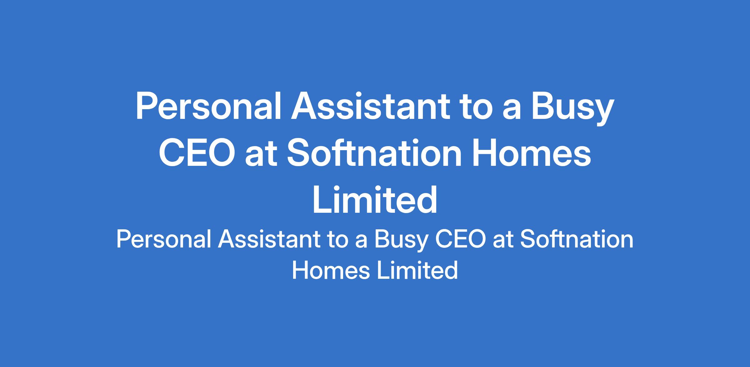 Softnation Homes Limited is recruiting to fill the position of: Personal Assistant to a Busy CEO. The position is located in Mainland, Lagos State. Salary: N120,000 - N150,000 monthly. Interested candidates should possess relevant qualifications with proven experience as a Personal Assistant or Executive Assistant.
