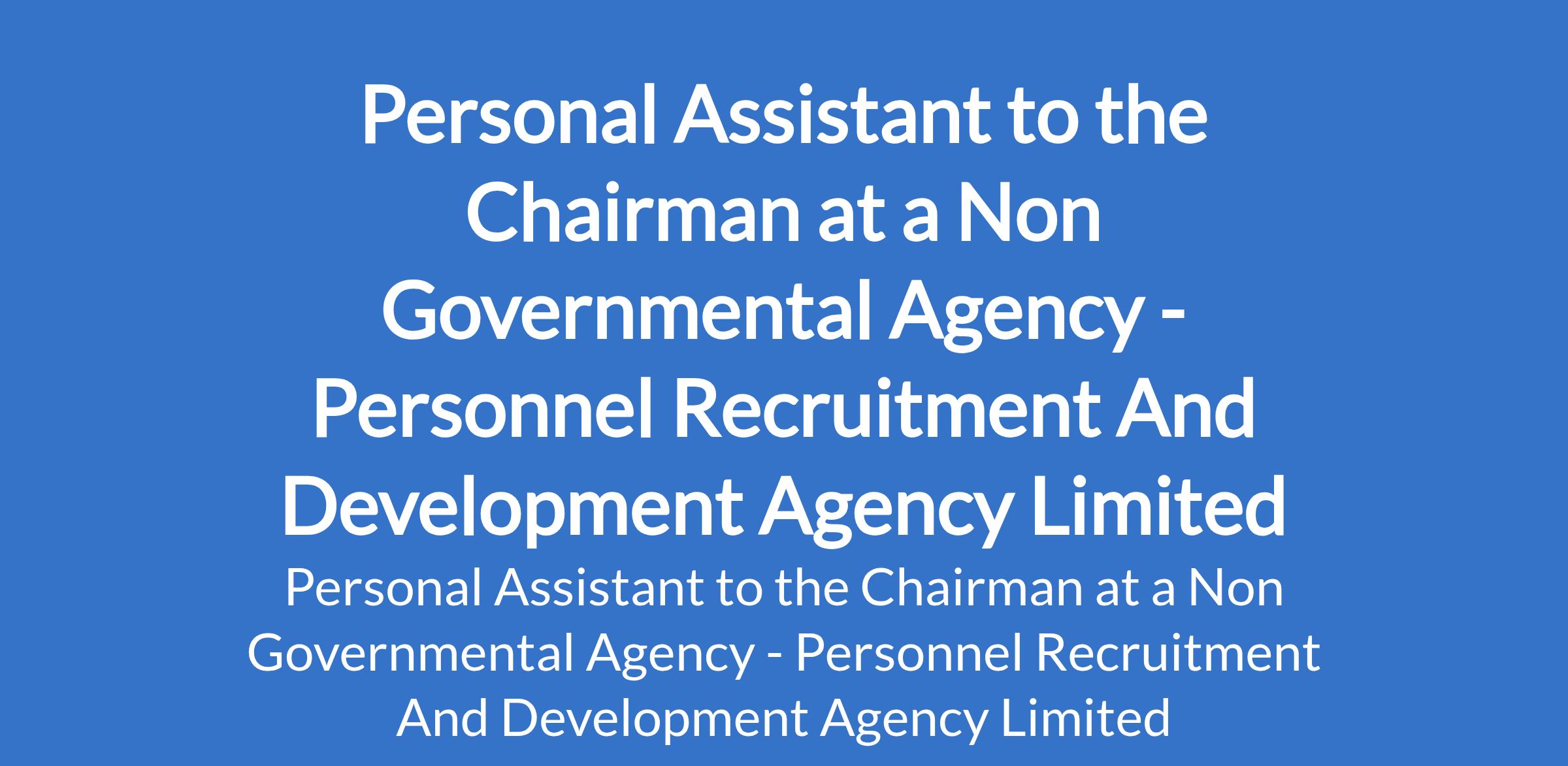 Personnel Recruitment And Development Agency Limited, on behalf of a Non Governmental Agency, is recruiting to fill the position of: Personal Assistant to the Chairman. The position is located in Ijebu Ode, Ogun State. Interested candidates should possess an OND, NCE in any of Social Sciences and must have the ability to work under pressure.