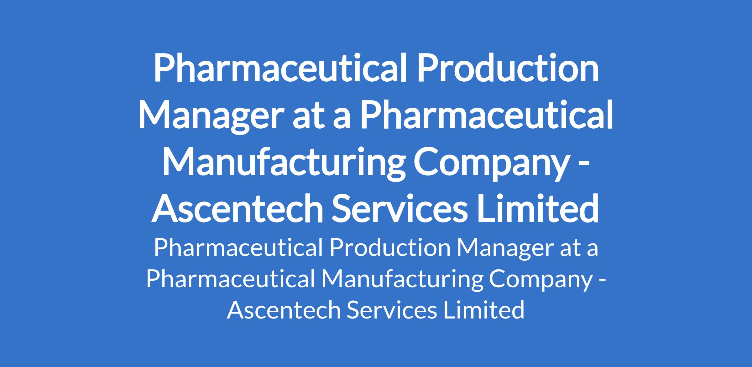 Ascentech Services Limited - Our client, a pharmaceutical manufacturing company is recruiting to fill the position of: Pharmaceutical Production Manager. The position is located in Calabar, Cross River State. Interested candidates should possess a B.Pharm Degree with 7 - 10 years manufacturing experience.