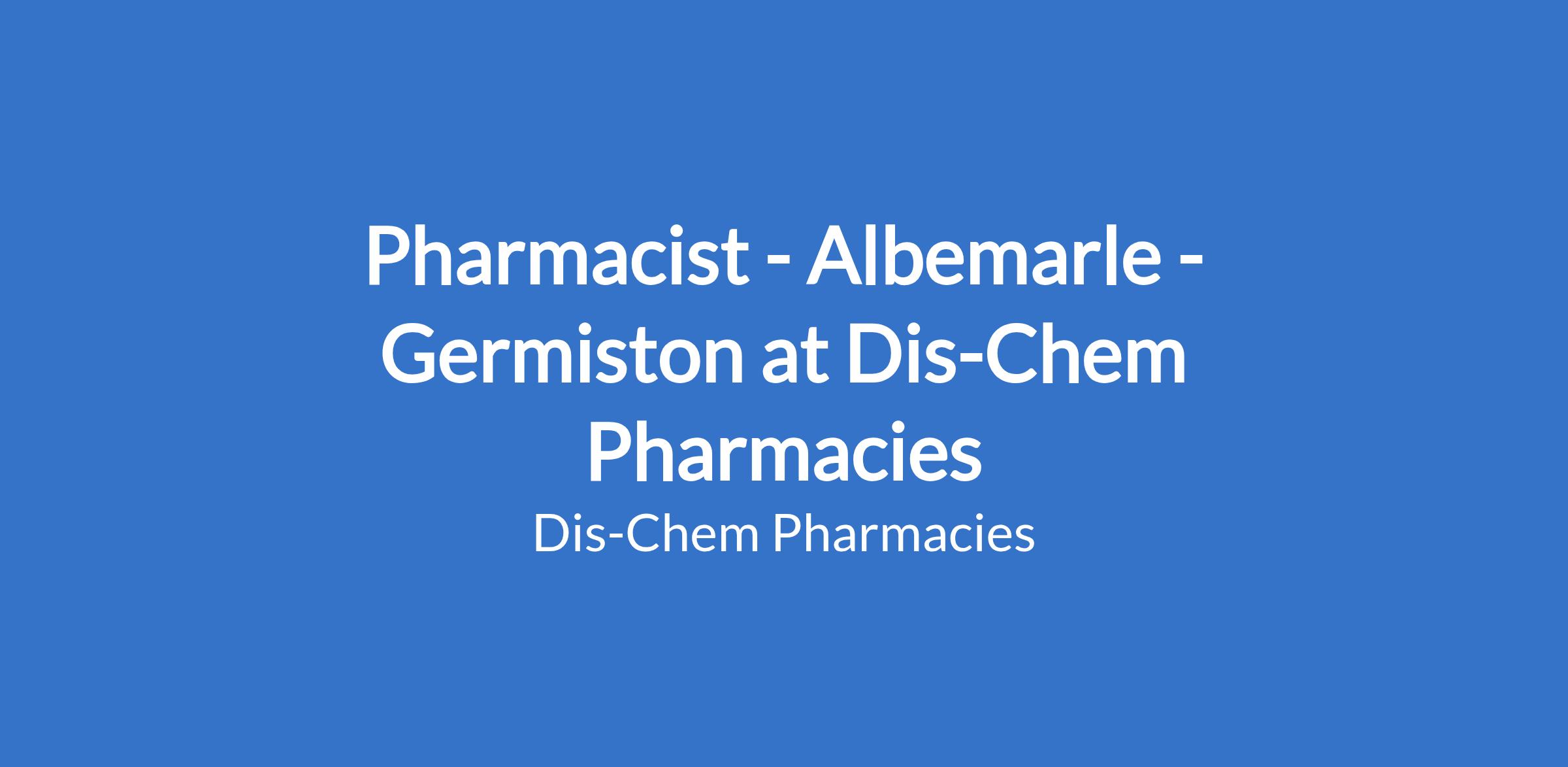 Dis-Chem Pharmacies require the services of a reputable Pharmacist for their Albemarle store. Your portfolio will cover the provision of pharmaceutical care by taking responsibility for patients' medicine-related needs, and being accountable for meeting these needs.