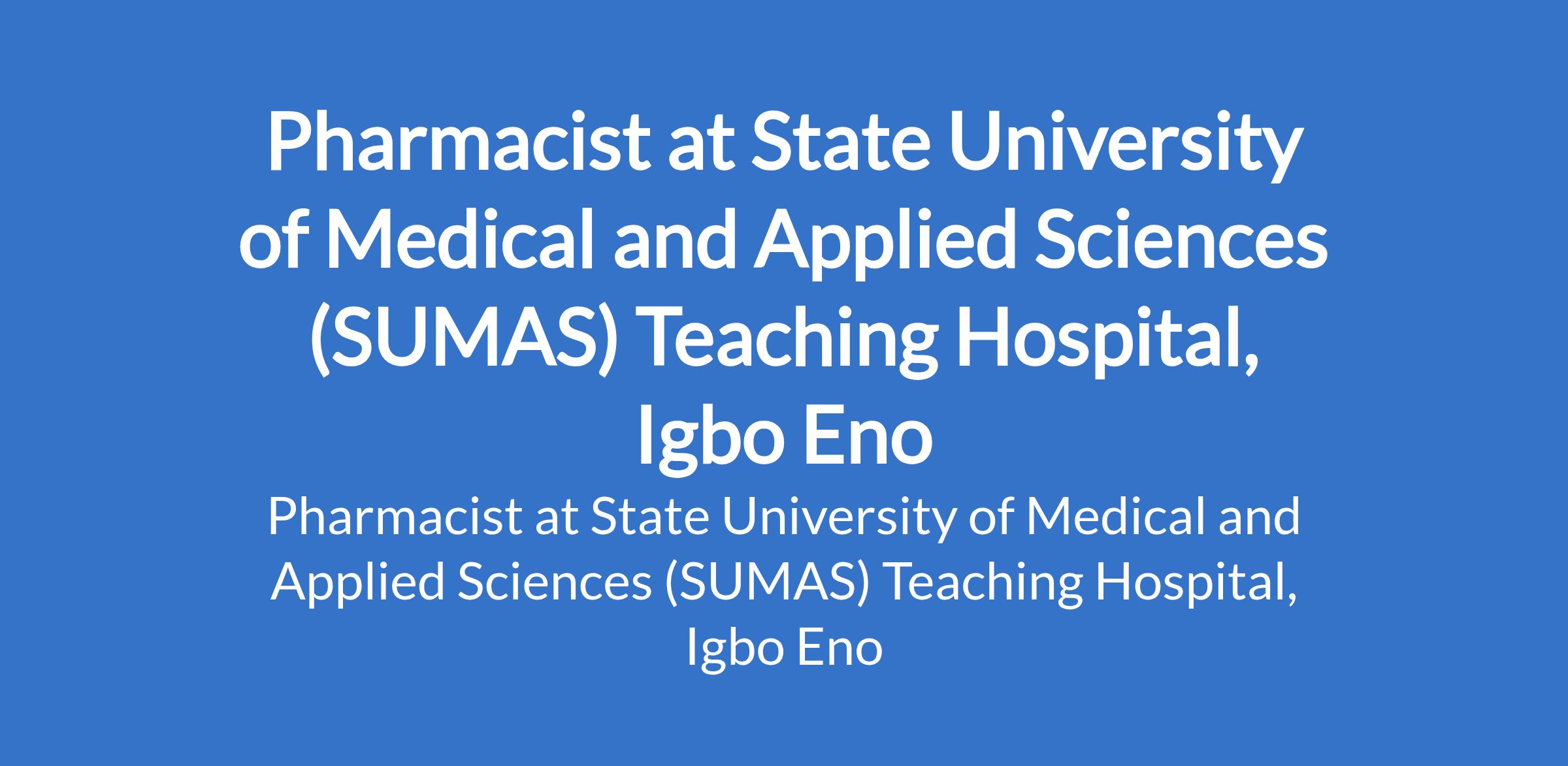 State University of Medical and Applied Sciences (SUMAS) Teaching Hospital, Igbo Eno invites applications from suitable candidates for the position of: Pharmacist. The position is located in Enugu State. Interested candidates should possess a Bachelor of Pharmacy (B.Pharm) from any recognized Institution with completion of a one-year internship and NYSC or exemption letter.