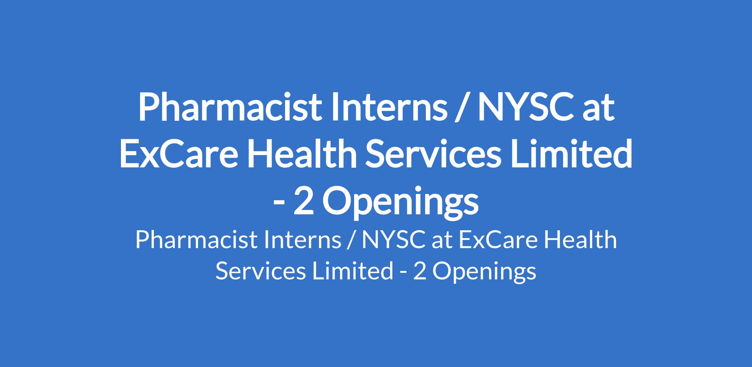 ExCare Health Services Limited is recruiting to fill the position of: Pharmacist Intern / NYSC. The position is located in Lagos, & Ogun States. Salary: N150,000 / month. Interested candidates should possess a Bachelors Degree in Pharmacy; valid license to practice as a pharmacist.