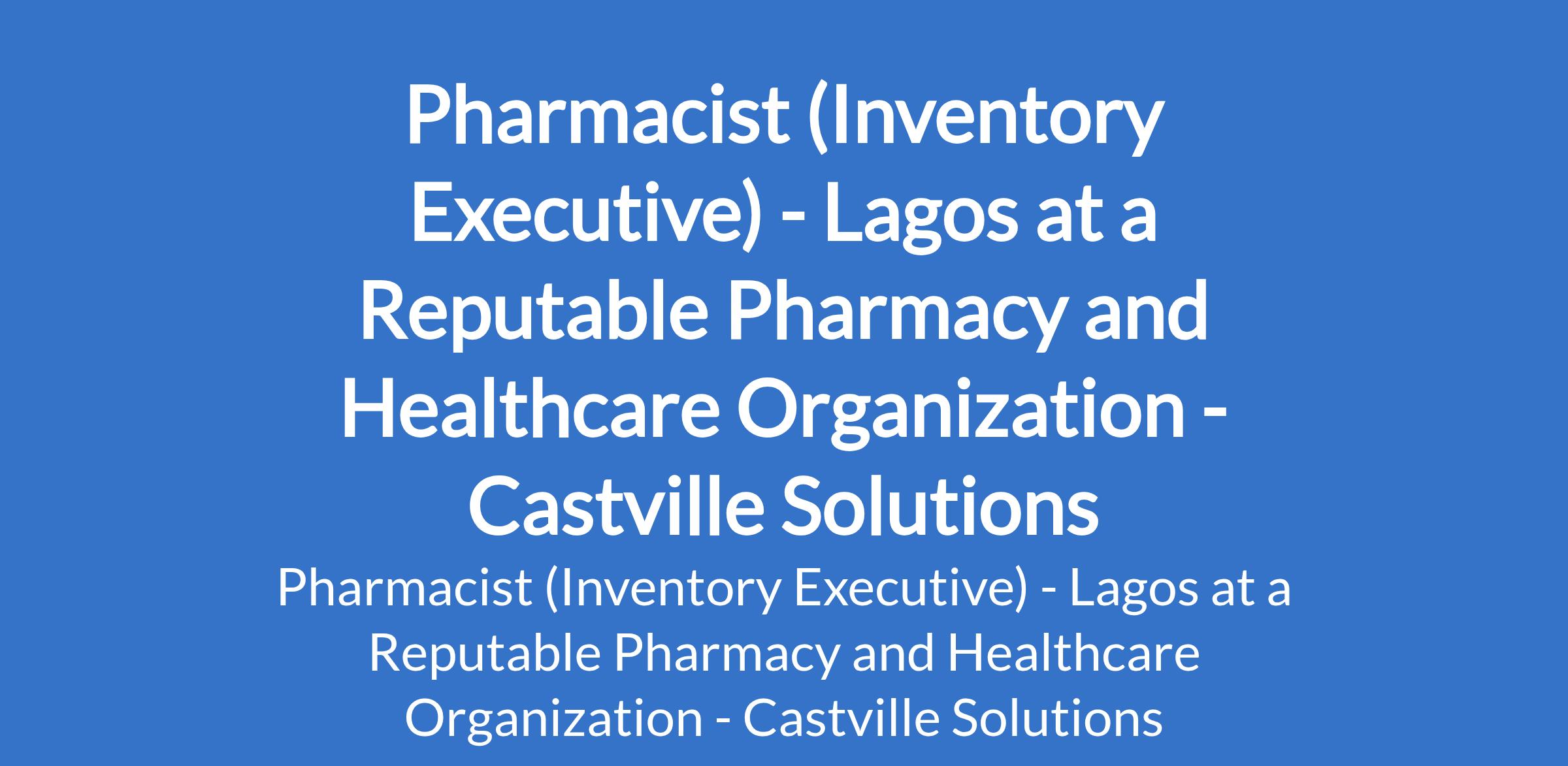 Castville Solutions - Our client, a reputable pharmacy and healthcare organization is recruiting to fill the position of: Pharmacist (Inventory Executive). The position is located in Gbagada, Lagos State. Salary: N200,000 - N300,000 monthly. Interested candidates should possess a Bachelors Degree in Pharmacy (B.Pharm or Pharm.D); must be a registered and licensed Pharmacist with the Pharmacists Council of Nigeria (PCN) with a minimum of 2 years of relevant experience in a retail or hospital pharmacy setting.