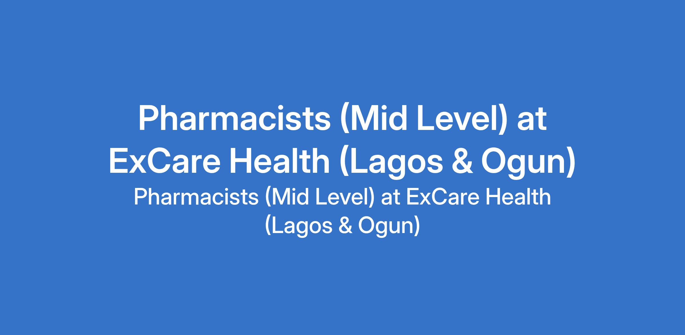 ExCare Health is recruiting to fill the position of: Pharmacist (Mid Level). The position is located in Lagos and Ogun State. Salary: N300,000 - N400,000 monthly. Interested candidates should possess a Bachelors Degree in Pharmacy with 3-5 years experience and must have valid license to practice as a Pharmacist.