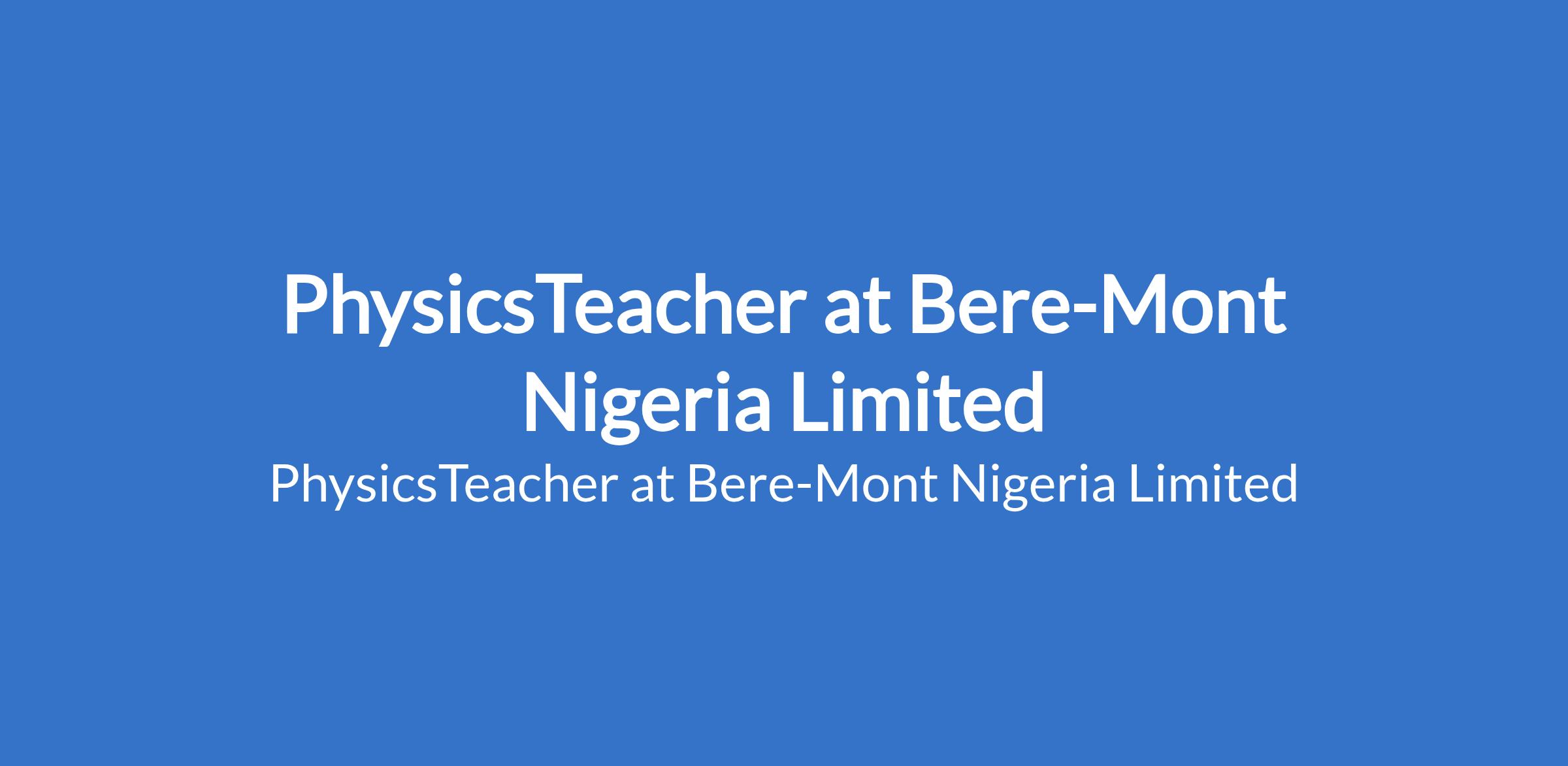 Bere-Mont Nigeria Limited is recruiting to fill the position of: PhysicsTeacher. The position is located in Igwuruta, Port Harcourt, Rivers State. Interested candidates should possess a B.Sc/ B.Sc + NCE / B.Sc (Ed) / B.Ed / PGDE / M.Ed with 3 years of teaching experience in the area of specialization.