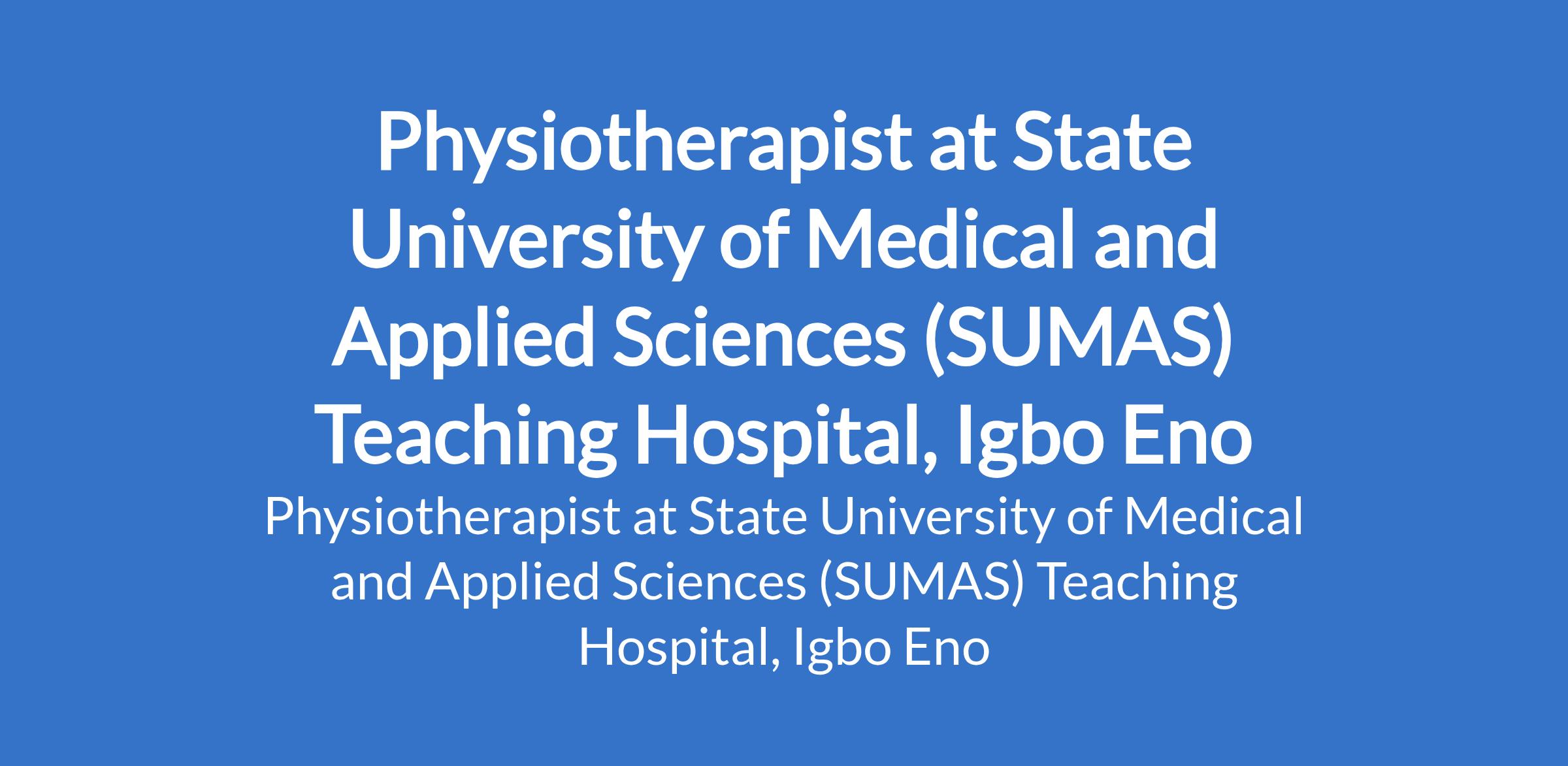State University of Medical and Applied Sciences (SUMAS) Teaching Hospital, Igbo Eno invites applications from suitable candidates for the position of: Physiotherapist. The position is located in Enugu State. Interested candidates should possess a Bachelor of Science (B.Sc.) or Bachelor of Medical Rehabilitation (BMR); in Physiotherapy from any recognized Institution with completion of a one-year internship and NYSC or examption letter.