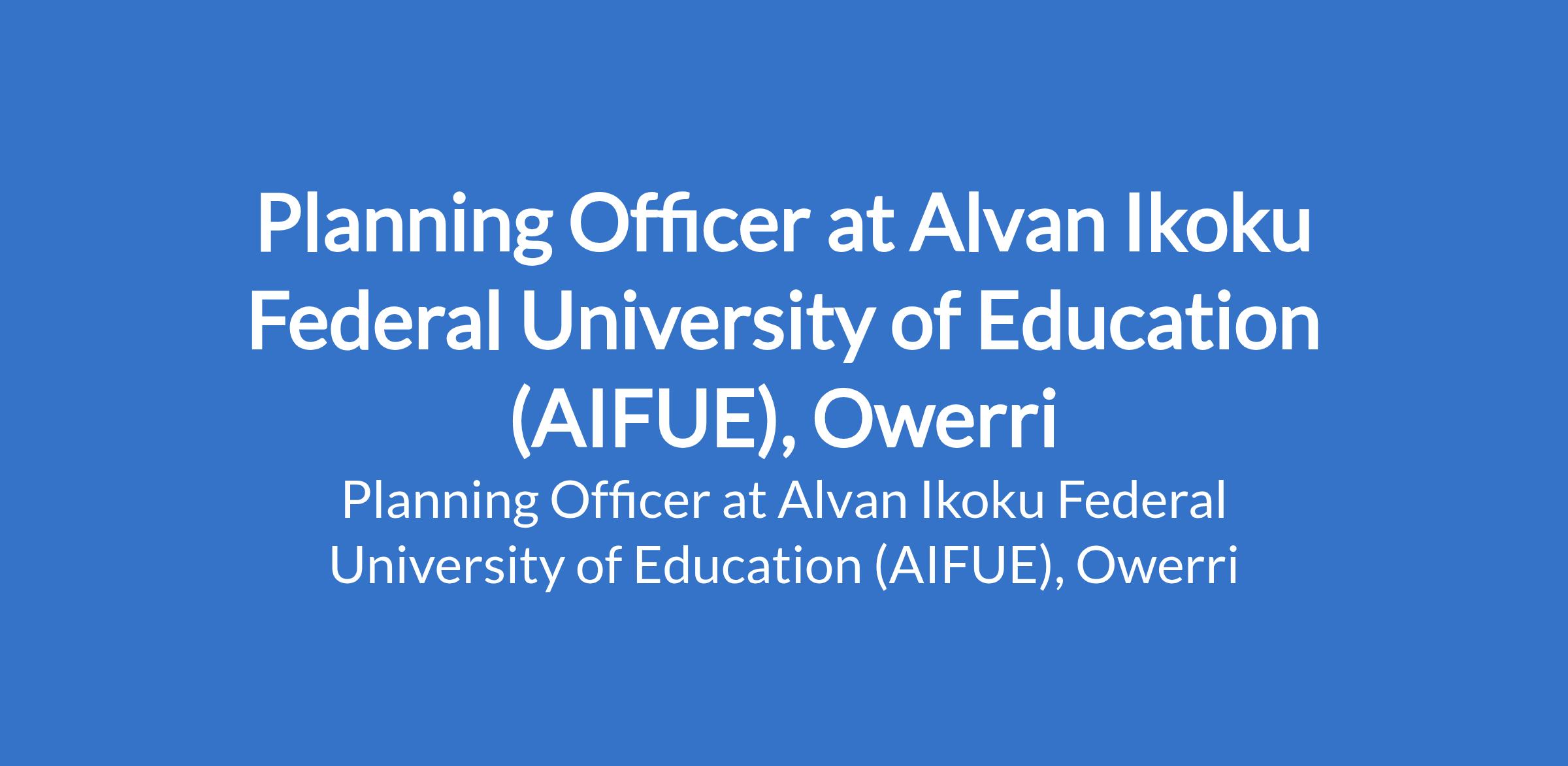 Alvan Ikoku Federal University of Education (AIFUE), Owerri invites applications from suitably qualified candidates for the position of: Planning Officer. The position is located in Imo State. Interested candidates should possess a B.Sc. Degree in Economics, Statistics, Mathematics, Geography or related fields.