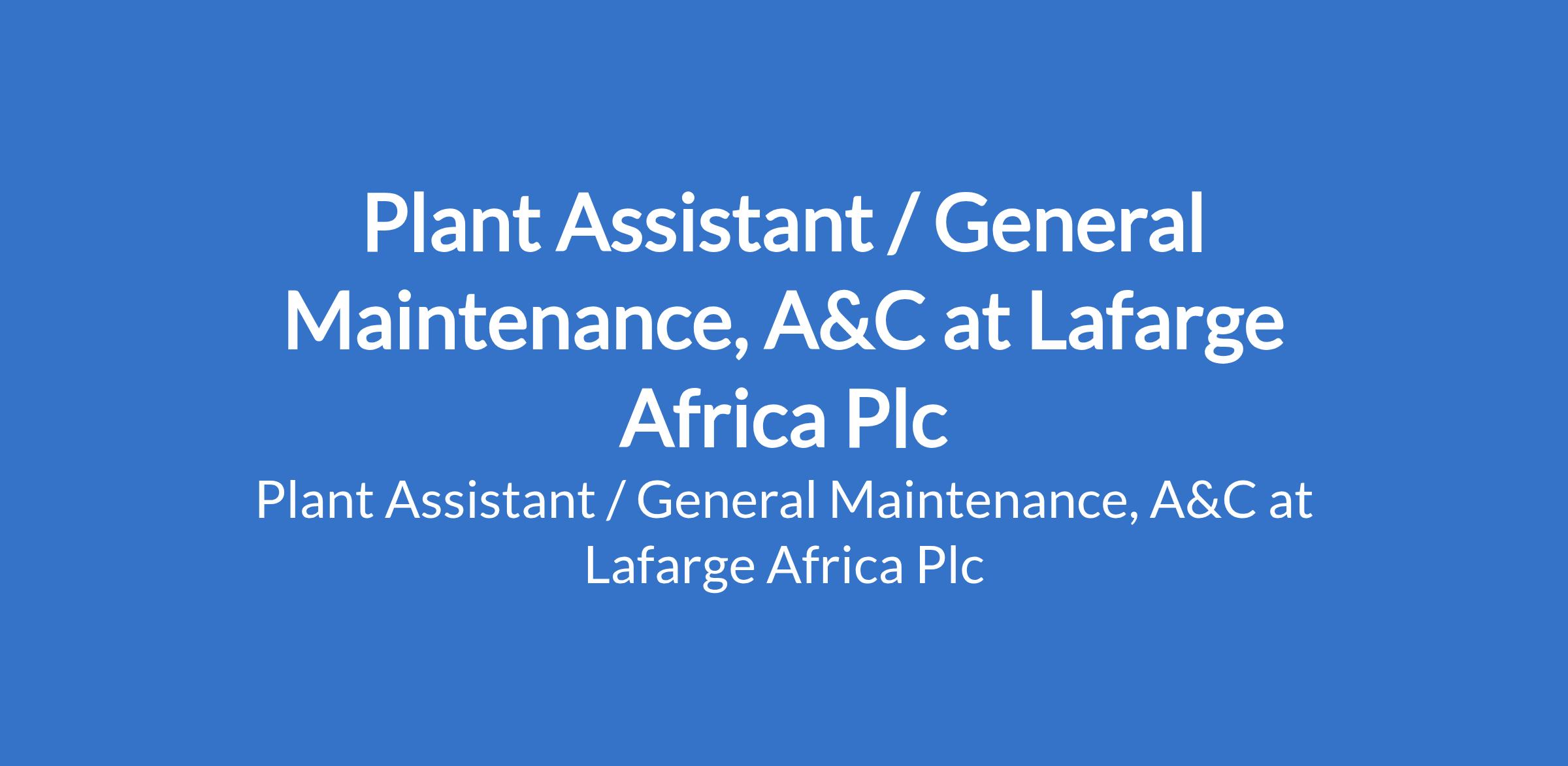 Lafarge Africa Plc is recruiting to fill the position of: Plant Assistant/ General Maintenance, A&C. The position is located in Port Harcourt, Rivers State. Interested candidates should possess an OND in Mechanical Engineering or equivalent with a minimum of 2 years experience working as a maintenance mechanic at a concrete manufacturing plant.