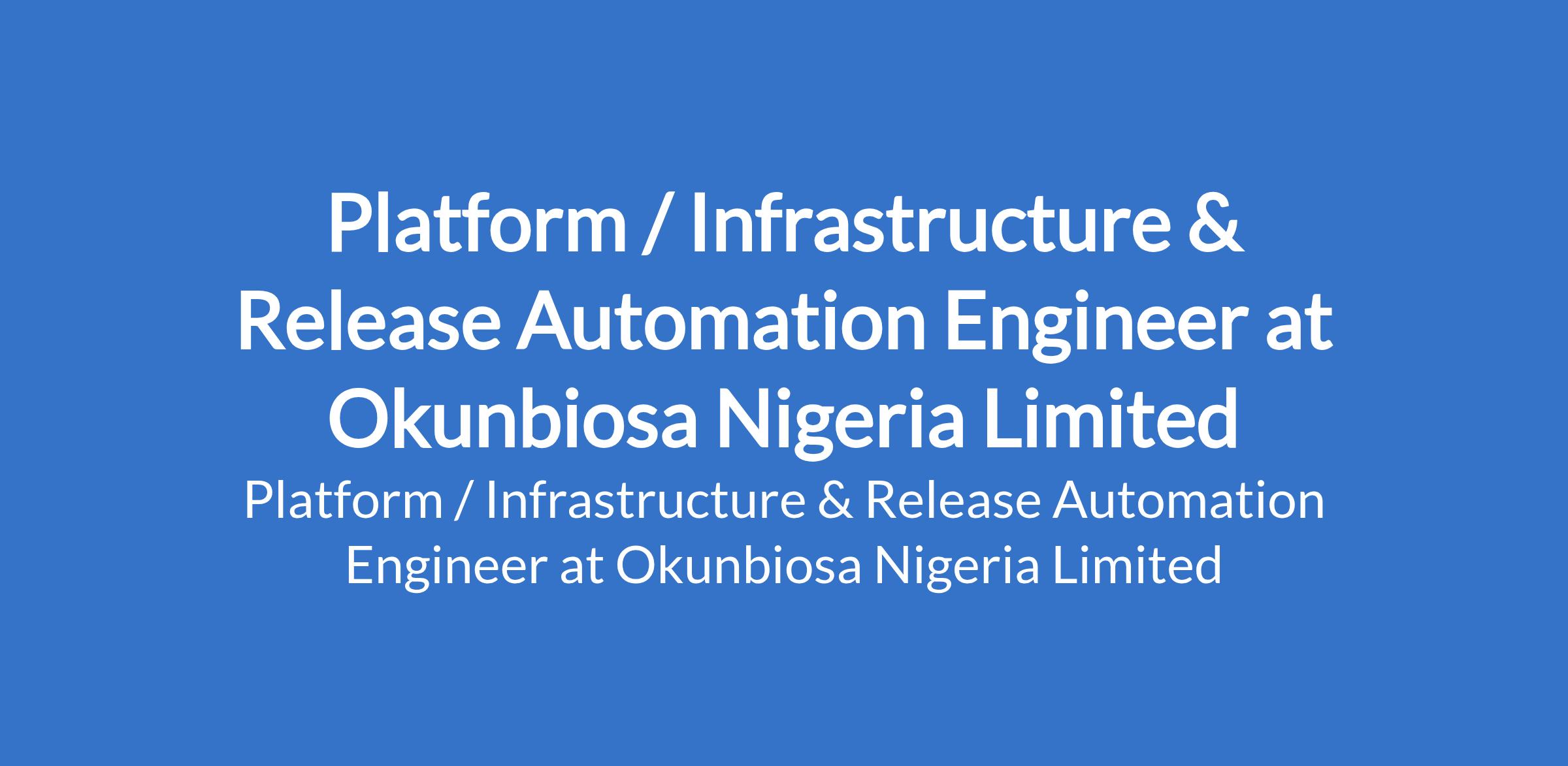 Okunbiosa Nigeria Limited is recruiting to fill the position of: Platform / Infrastructure & Release Automation Engineer. The position is located in Abuja (FCT), & Lagos State. Salary: N400,000 - N600,000 / month. Interested candidates should possess a Degree in Computer Science, Engineering, or a related field (preferred) with 3+ years of experience in DevOps, Platform Engineering, Infrastructure, or Release Automation roles.