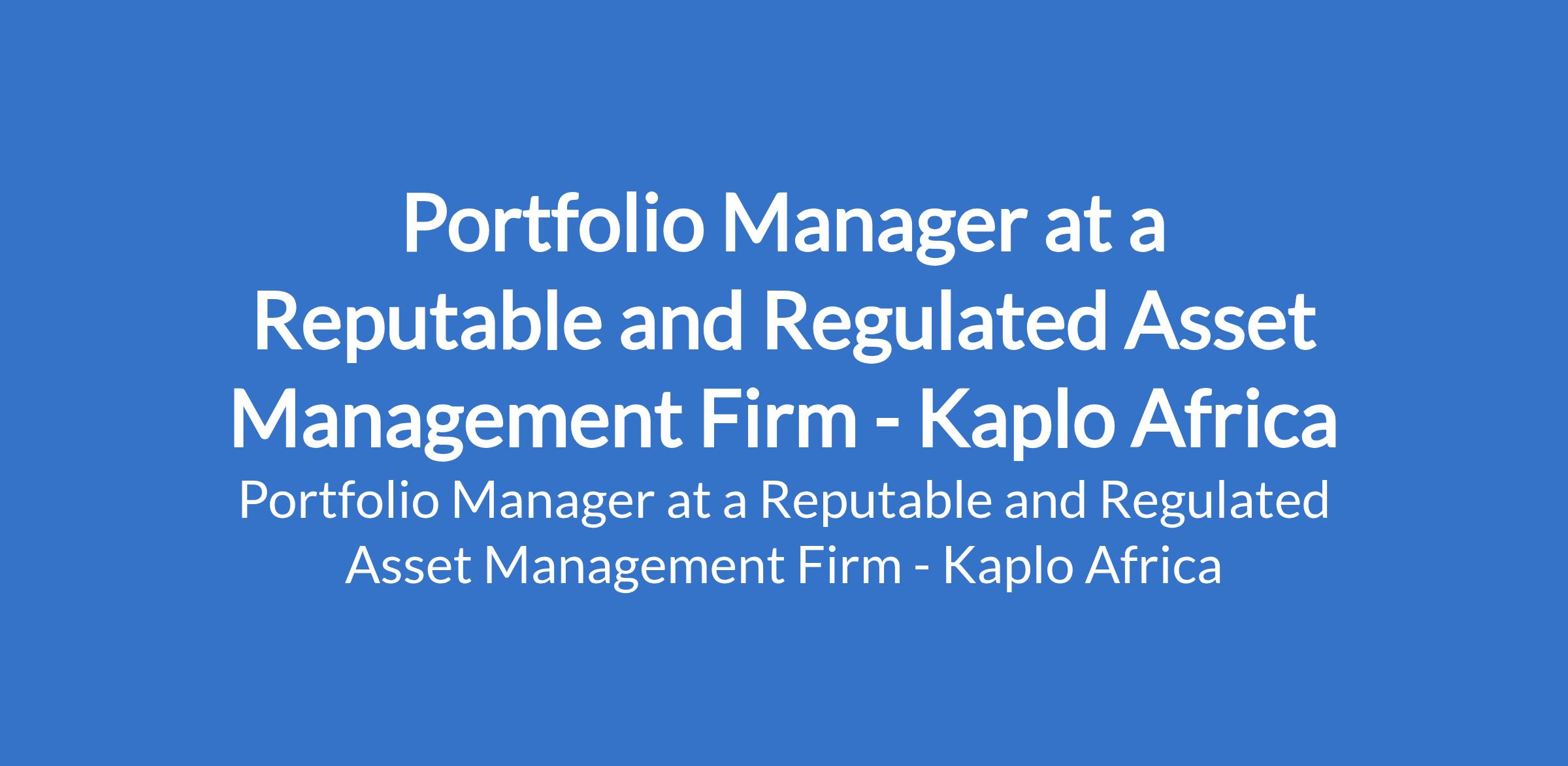 Kaplo is Africa -Our client, a reputable and regulated Asset Management firm is recruiting to fill the position of: Portfolio Manager. The position is located in Lagos State. Salary: N1,400,000 Monthly. Interested candidates should possess relevant qualifications with 58 years experience in a registered and licensed asset management firm.