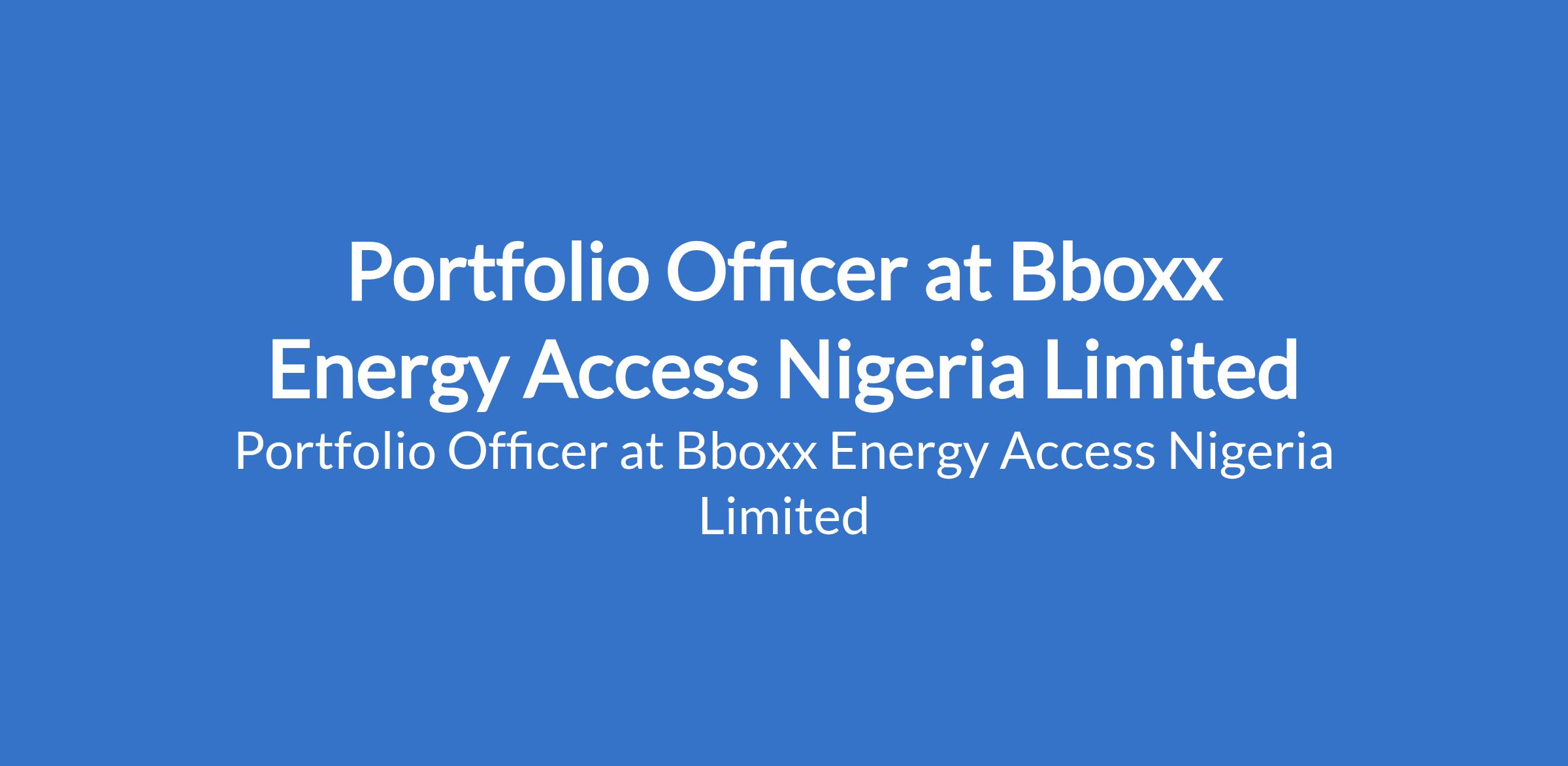 Bboxx Energy Access Nigeria Limited is recruiting to fill the position of: Portfolio Officer. The position is located in Alausa / Ikeja, Lagos State. Interested candidates should possess a Bachelors Degree in Finance, Business Administration, Economics, or a related field with 13 years of experience in a similar role.