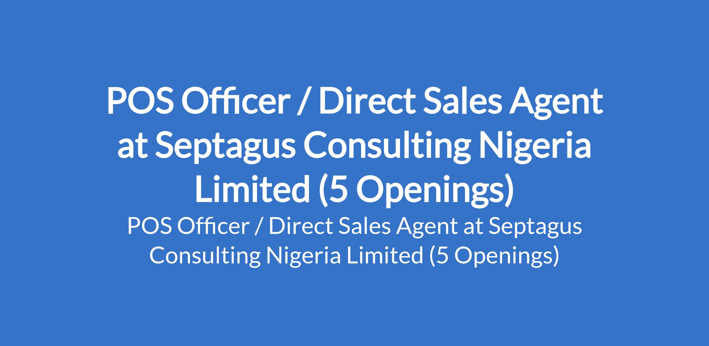 Septagus Consulting Nigeria Limited is recruiting to fill the position of: POS Officer / Direct Sales Agent. The position is located in Abia, Akwa Ibom, Anambra, Bayelsa and Rivers States. Salary: N93,000 - N100,000 / month. Interested candidates should possess relevant qualifications with experience.