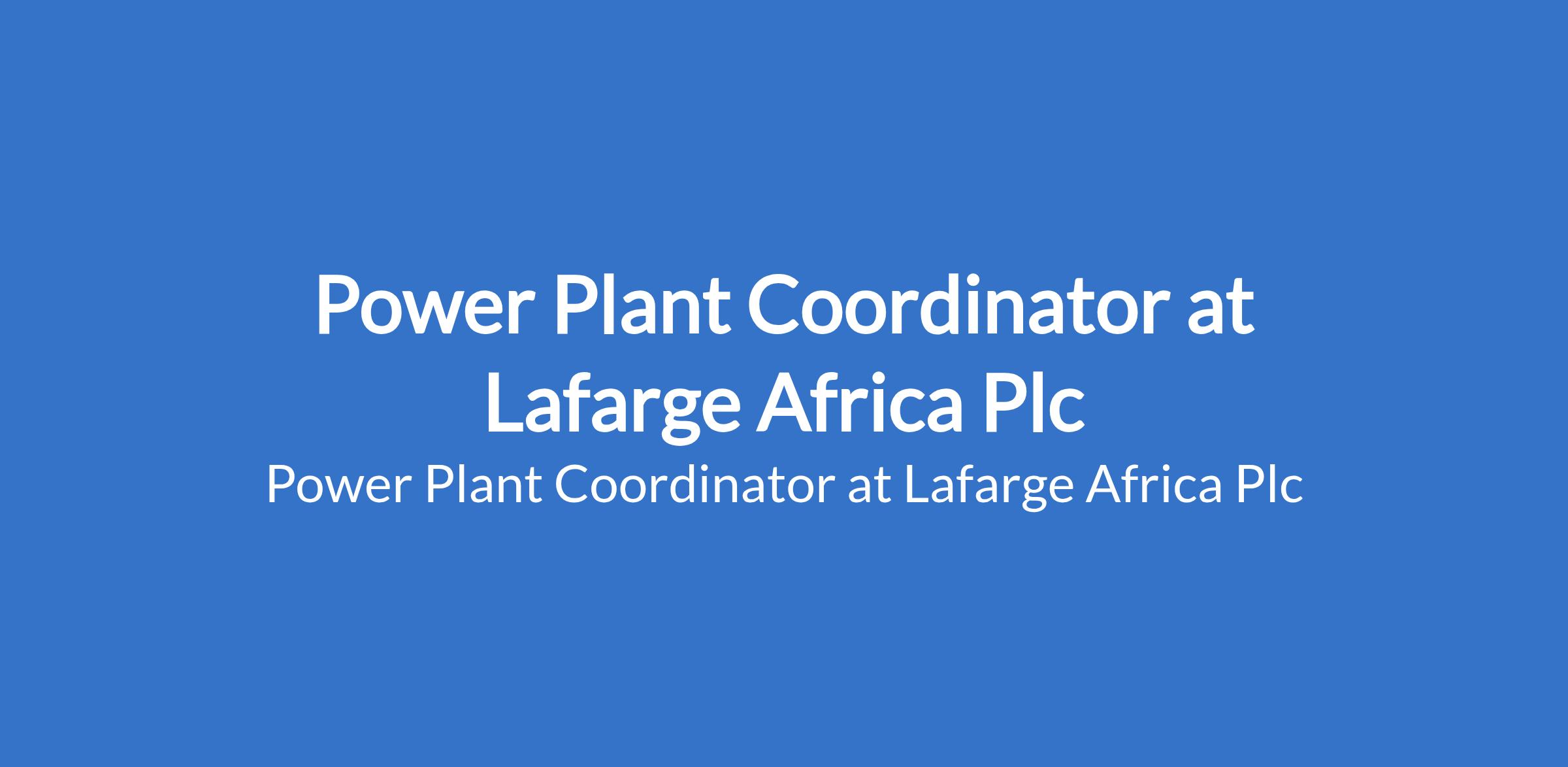 Lafarge Africa Plc is recruiting to fill the position of: Power Plant Coordinator. The position is located in Ewekoro, Ogun State. Interested candidates should possess a minimum of HND in Electrical Engineering with a minimum of 10 years Manufacturing operations experience.
