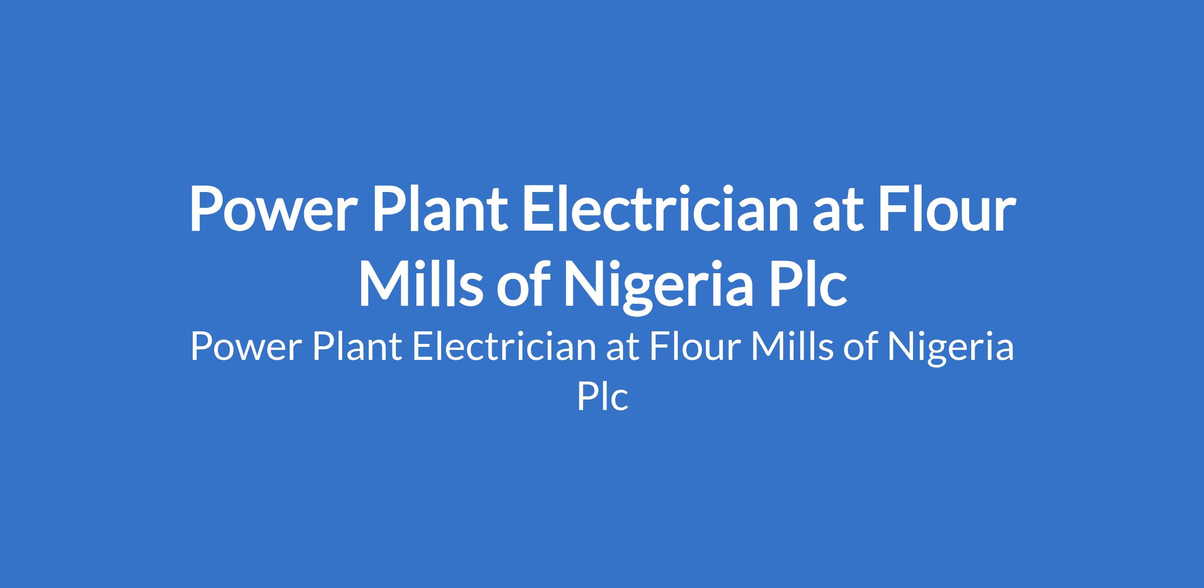 Flour Mills of Nigeria Plc is recruiting to fill the position of: Power Plant Electrician. The position is located in Apapa, Lagos State. Interested candidates should possess 5 OLevel credits, including Mathematics and English; NABTEB / City & Guilds (C&G) Technical in Electrical or related discipline with 2 3 years handson experience in industrial electrical maintenance, utilities, or power generation environment.