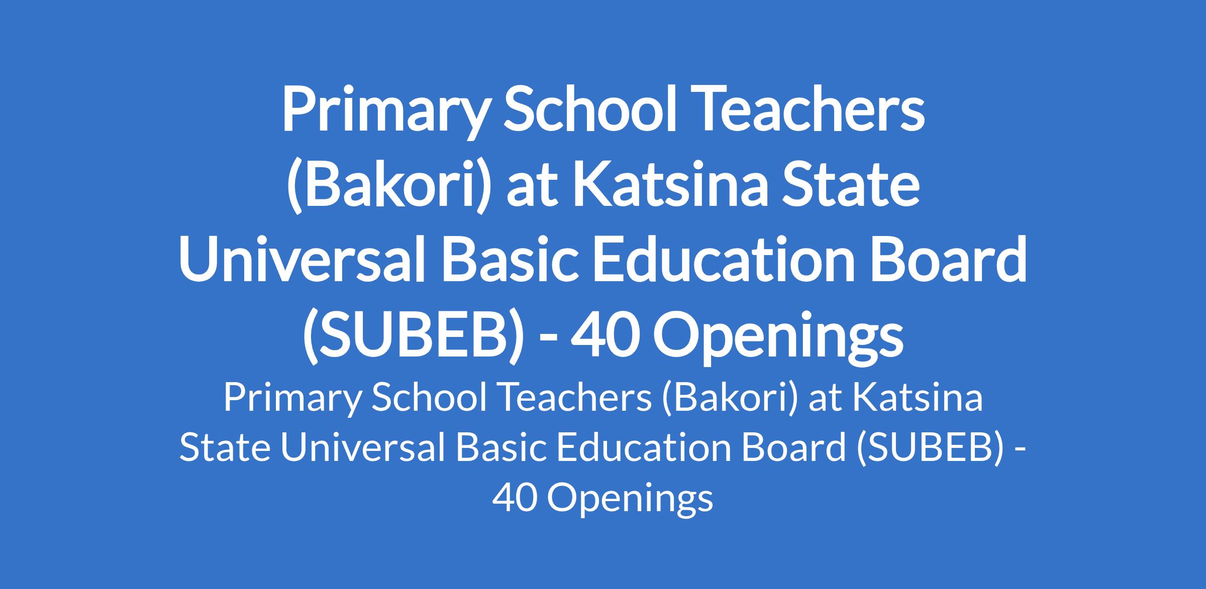Katsina State Universal Basic Education Board (SUBEB) is inviting applications from suitable candidates to fill the position of: Primary School Teacher. The position is located in Bakori, Katsina State. Interested candidates should possess an possess an NCE in a relevant field.