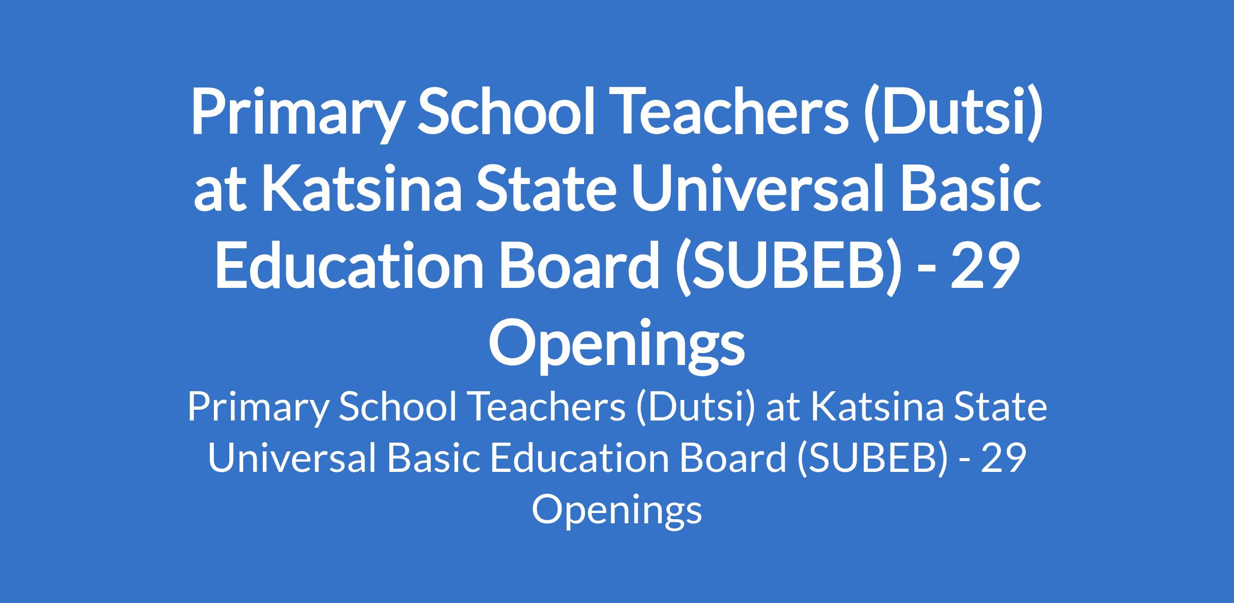 Katsina State Universal Basic Education Board (SUBEB) is inviting applications from suitable candidates to fill the position of: Primary School Teacher. The position is located in Dutsi, Katsina State. Interested candidates should possess an NCE in a relevant field.