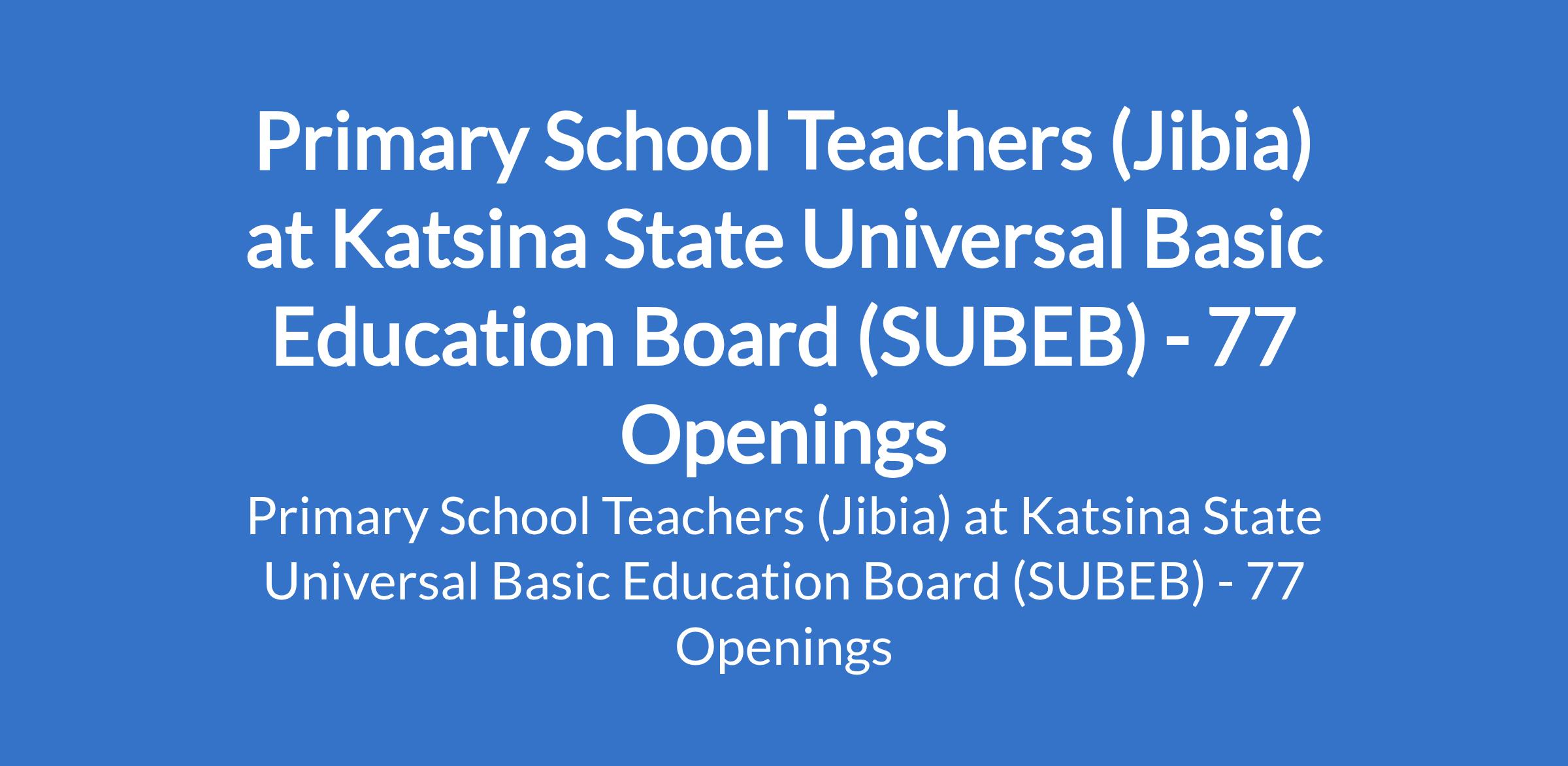 Katsina State Universal Basic Education Board (SUBEB) is inviting applications from suitable candidates to fill the position of: Primary School Teacher. The position is located in Jibia, Katsina State. Interested candidates should possess an possess an NCE in a relevant field.