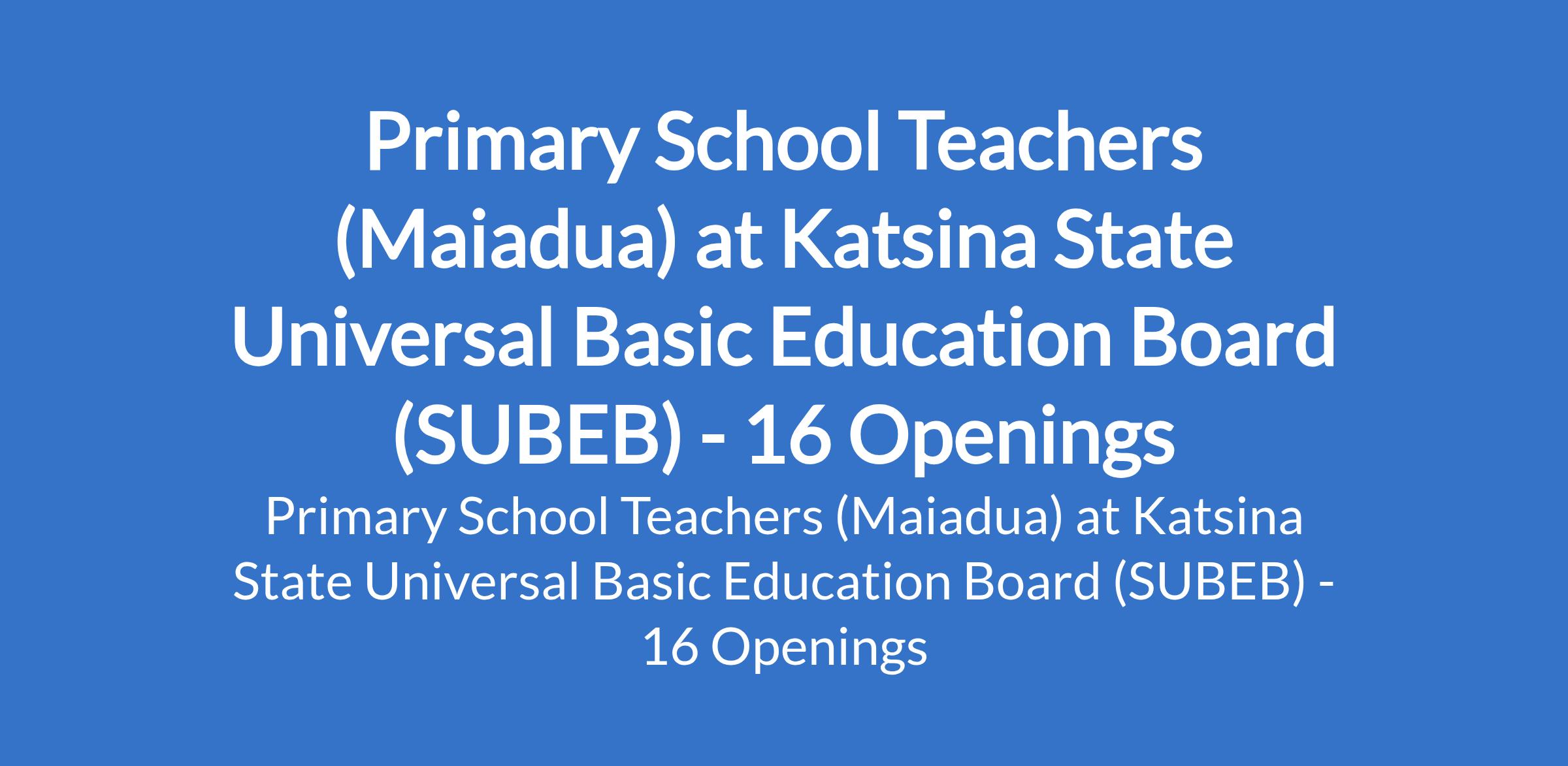 Katsina State Universal Basic Education Board (SUBEB) is inviting applications from suitable candidates to fill the position of: Primary School Teacher. The position is located in Maiadua, Katsina State. Interested candidates should possess an NCE in a relevant field.