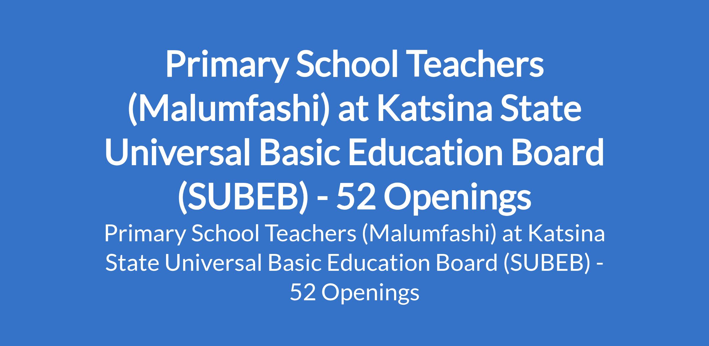 Katsina State Universal Basic Education Board (SUBEB) is inviting applications from suitable candidates to fill the position of: Primary School Teacher. The position is located in Malumfashi, Katsina State. Interested candidates should possess an possess an NCE in a relevant field.