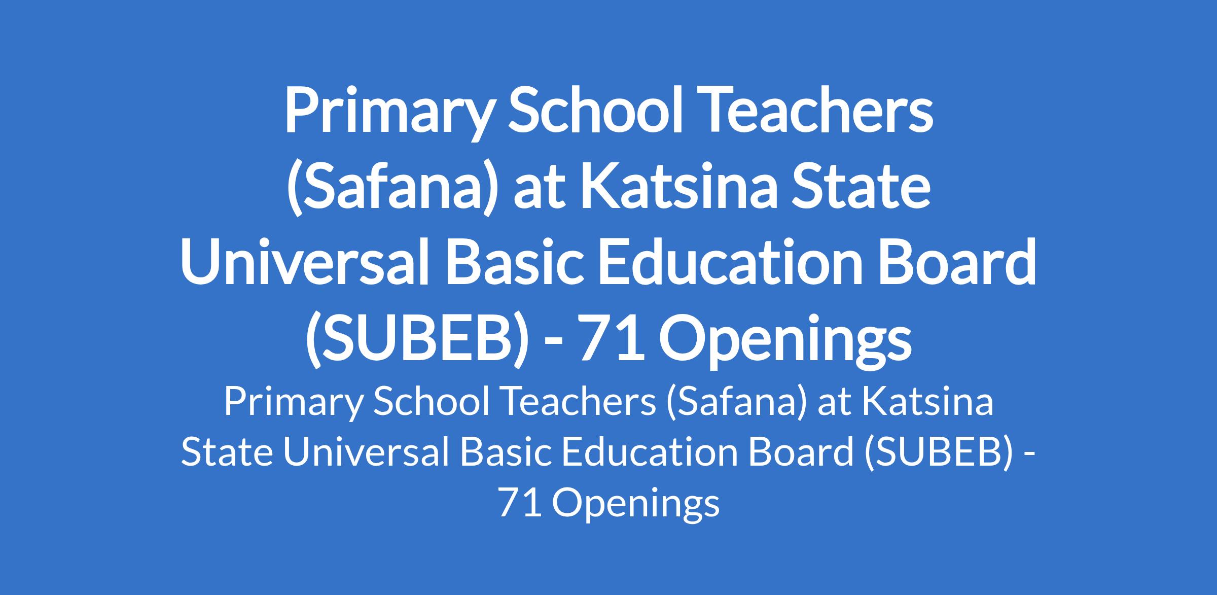 Katsina State Universal Basic Education Board (SUBEB) is inviting applications from suitable candidates to fill the position of: Primary School Teacher. The position is located in Safana, Katsina State. Interested candidates should possess an NCE in a relevant field.