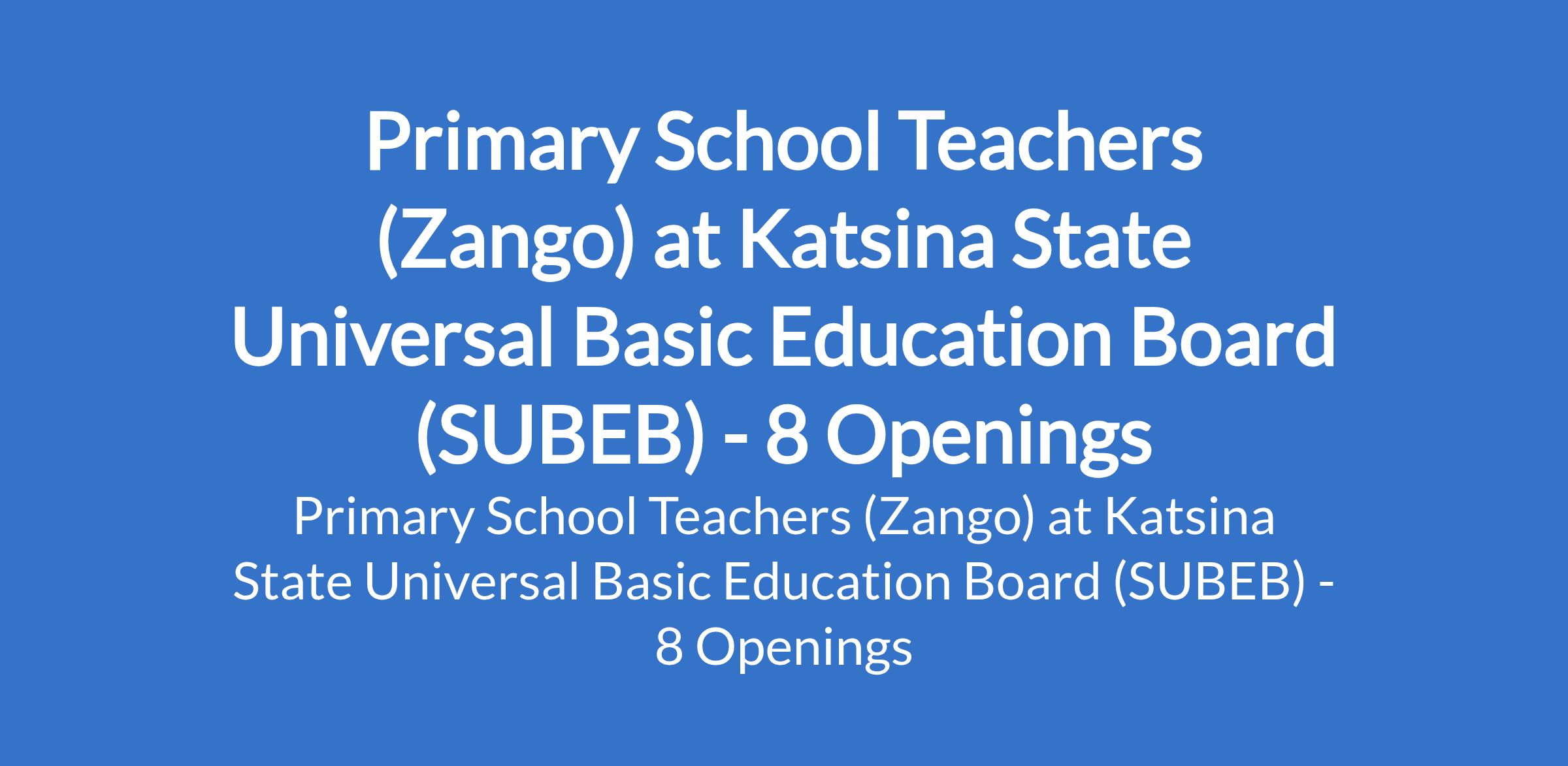 Katsina State Universal Basic Education Board (SUBEB) is inviting applications from suitable candidates to fill the position of: Primary School Teacher. The position is located in Zango, Katsina State. Interested candidates should possess an NCE in a relevant field.