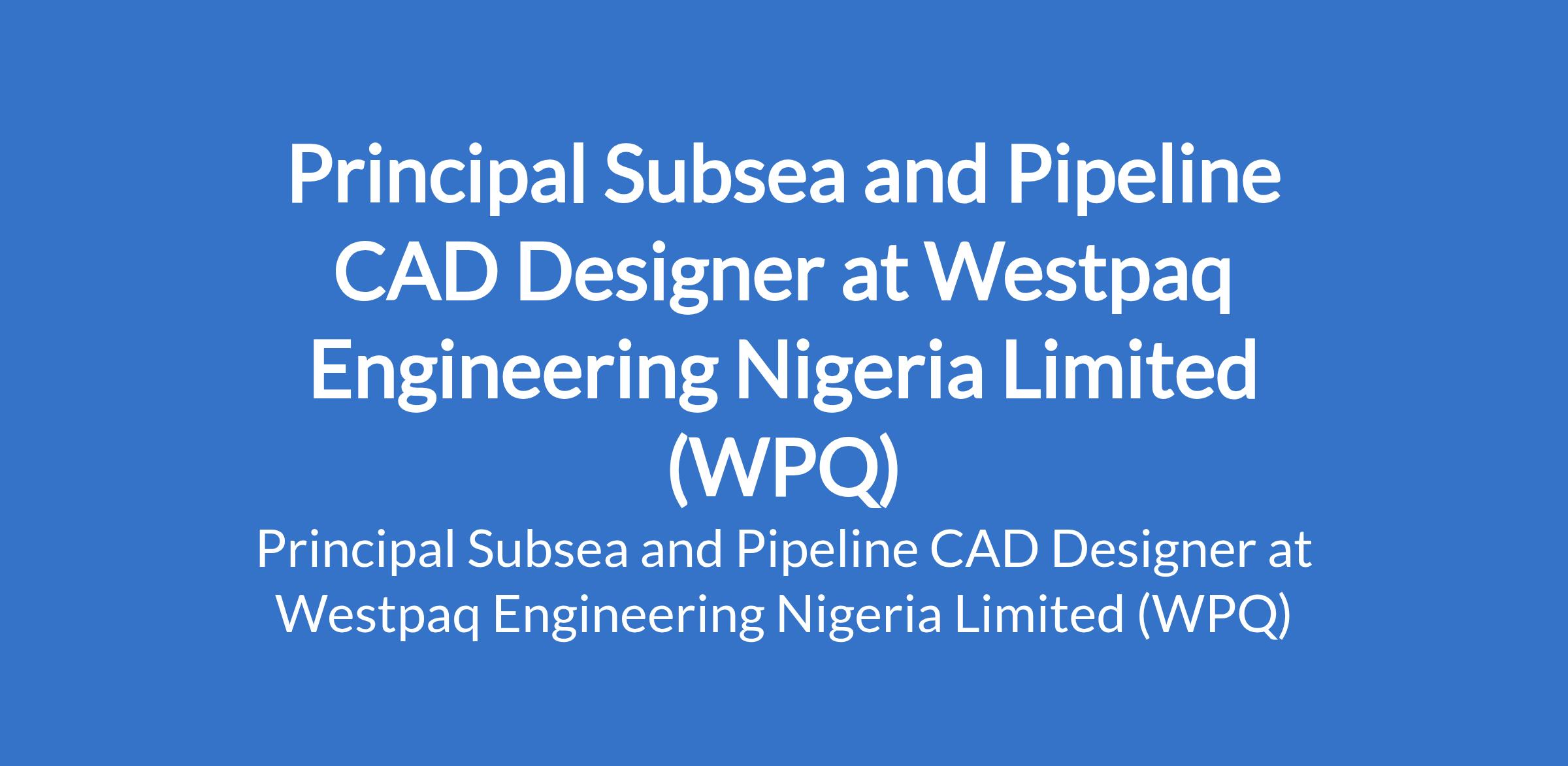 Westpaq Engineering Nigeria Limited (WPQ) is recruiting to fill the position of: Principal Subsea and Pipeline CAD Designer. The position is located in Lagos State. Interested candidates should possess a Bachelors Degree in Engineering or equivalent, preferably in Subsea Engineering with a minimum of 10 years of relevant experience in upstream E&P projects, with strong exposure to offshore design and execution environments.