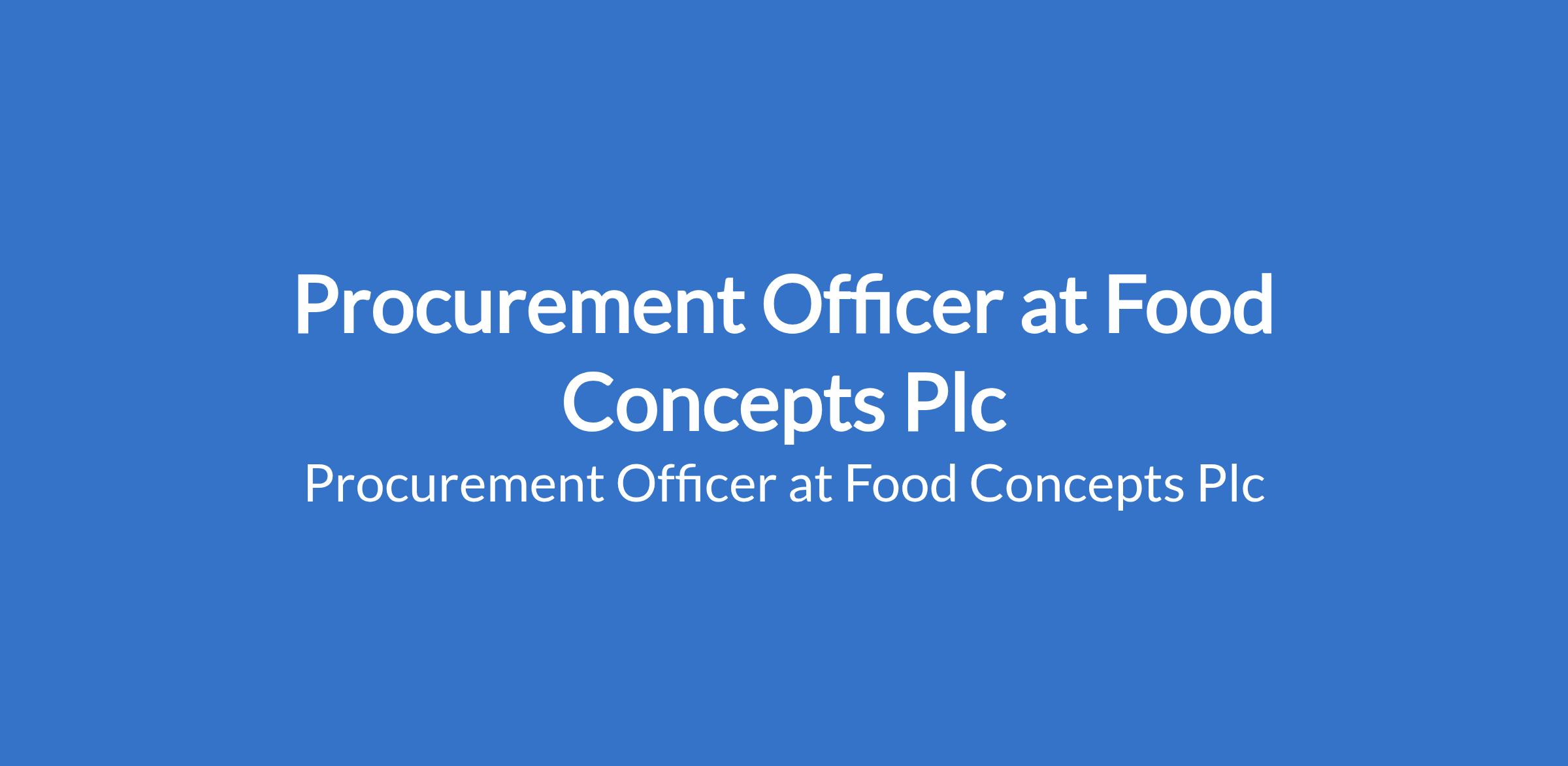 Food Concepts Plc is recruiting to fill the position of: Procurement Officer. Interested candidates should possess a good First Degree in Social / Management / Physical Sciences; Membership of the CIPS, CILS, CILCS, CISCOM, Lean Six Sigma or any other related professional qualification is an added advantage with a minimum of 2 years experience in a similar role, especially in the QSR/Food Industry sector.