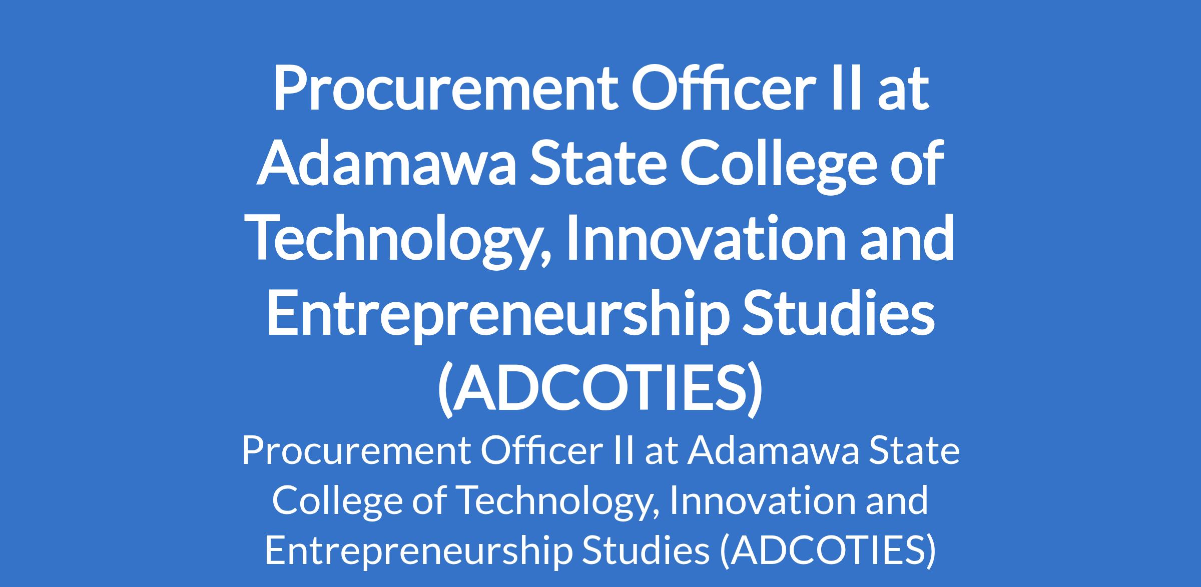 Adamawa State College of Technology, Innovation and Entrepreneurship Studies (ADCOTIES) is recruiting to fill the position of: Procurement Officer II. The position is located in Gulak, Adamawa State. Interested candidates should possess a Bachelor's Degree (minimum of Second-Class Lower) from a recognised Instituion with at least three years post qualification cognate work experience or a Master's Degree and must be an indigene of Adamawa.