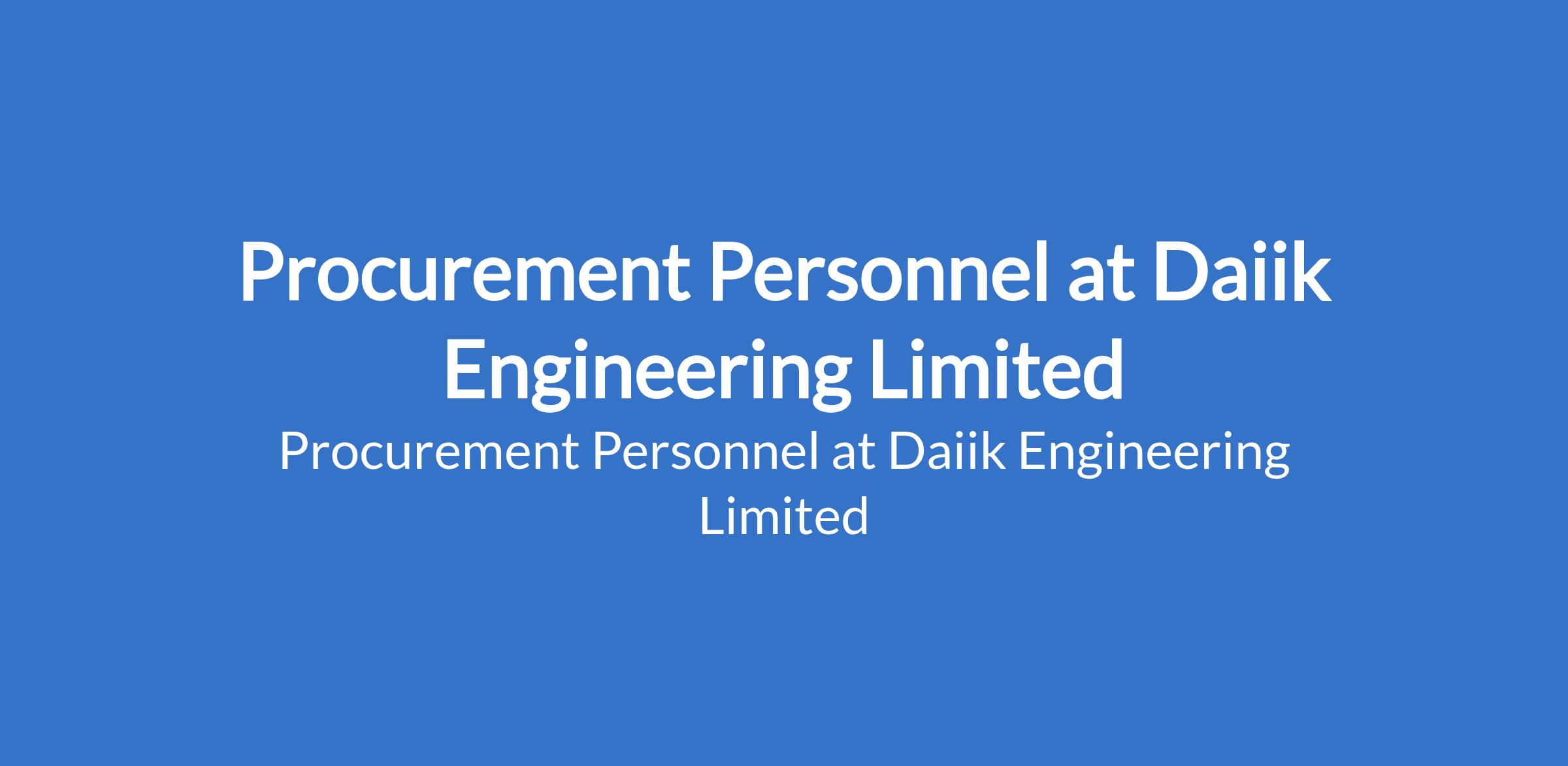Daiik Engineering Limited is recruiting to fill the position of: Procurement Personnel. The position is located in Port Harcourt, Rivers State. Interested candidates should possess a B.Sc. / HND qualification in Supply Chain Management, Business Administration, Engineering, or relevant Social Sciences; an MBA or a post-graduate Diploma in Supply Chain Management or Logistics is an added advantage with 25+ years of procurement experience within the oil and gas sector (upstream or downstream).