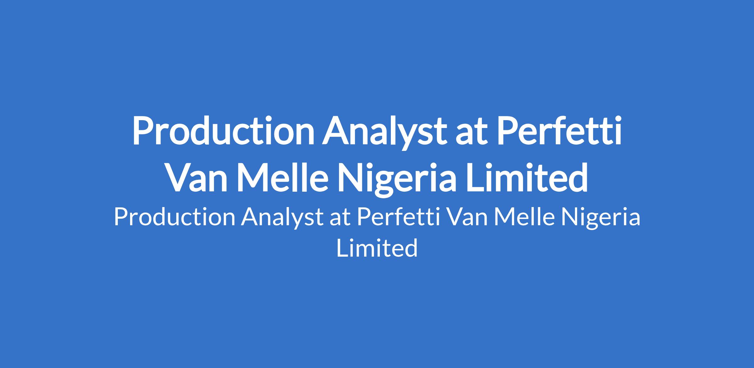 Perfetti Van Melle Nigeria Limited is recruiting to fill the position of: Production Analyst. The position is located in Lagos State. Interested candidates should possess an HND / BSc in Engineering, Mathematics, or a numerically related discipline with a minimum of 2 years of relevant experience in production, manufacturing, or operations management, including knowledge of lean manufacturing.