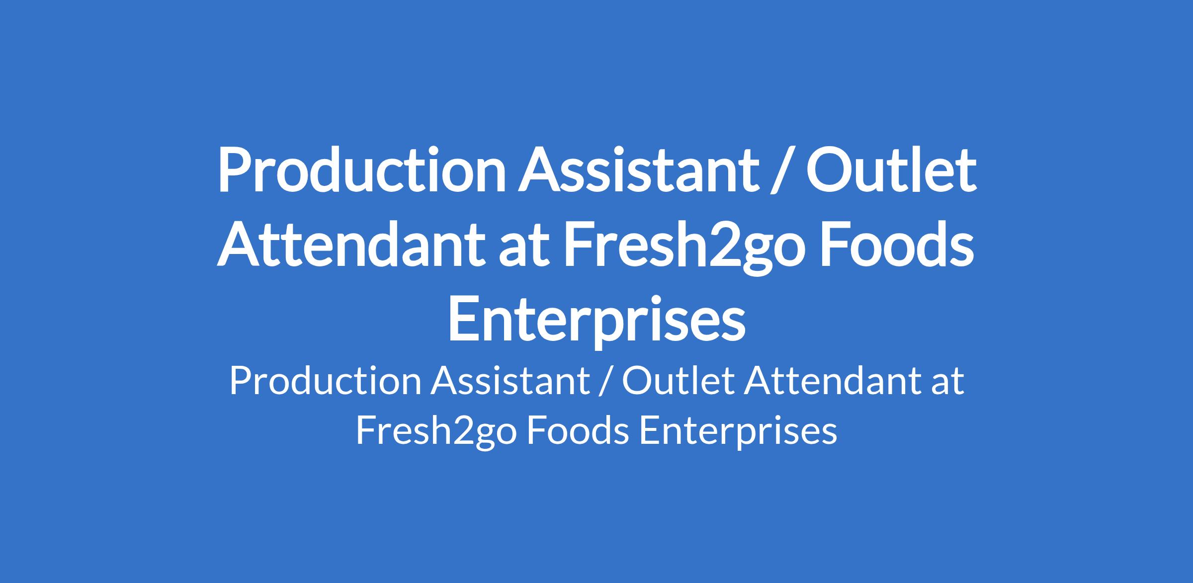Fresh2go Foods Enterprises is recruiting to fill the position of: Production Assistant / Outlet Attendant. The position is located in Jericho, Ibadan - Oyo State. Salary: N65,000 - N70,000 monthly. Interested candidates should possess a minimum education qualification of an NCE, OND, or HND with relevant work experience, and must be responsible, neat, and presentable.
