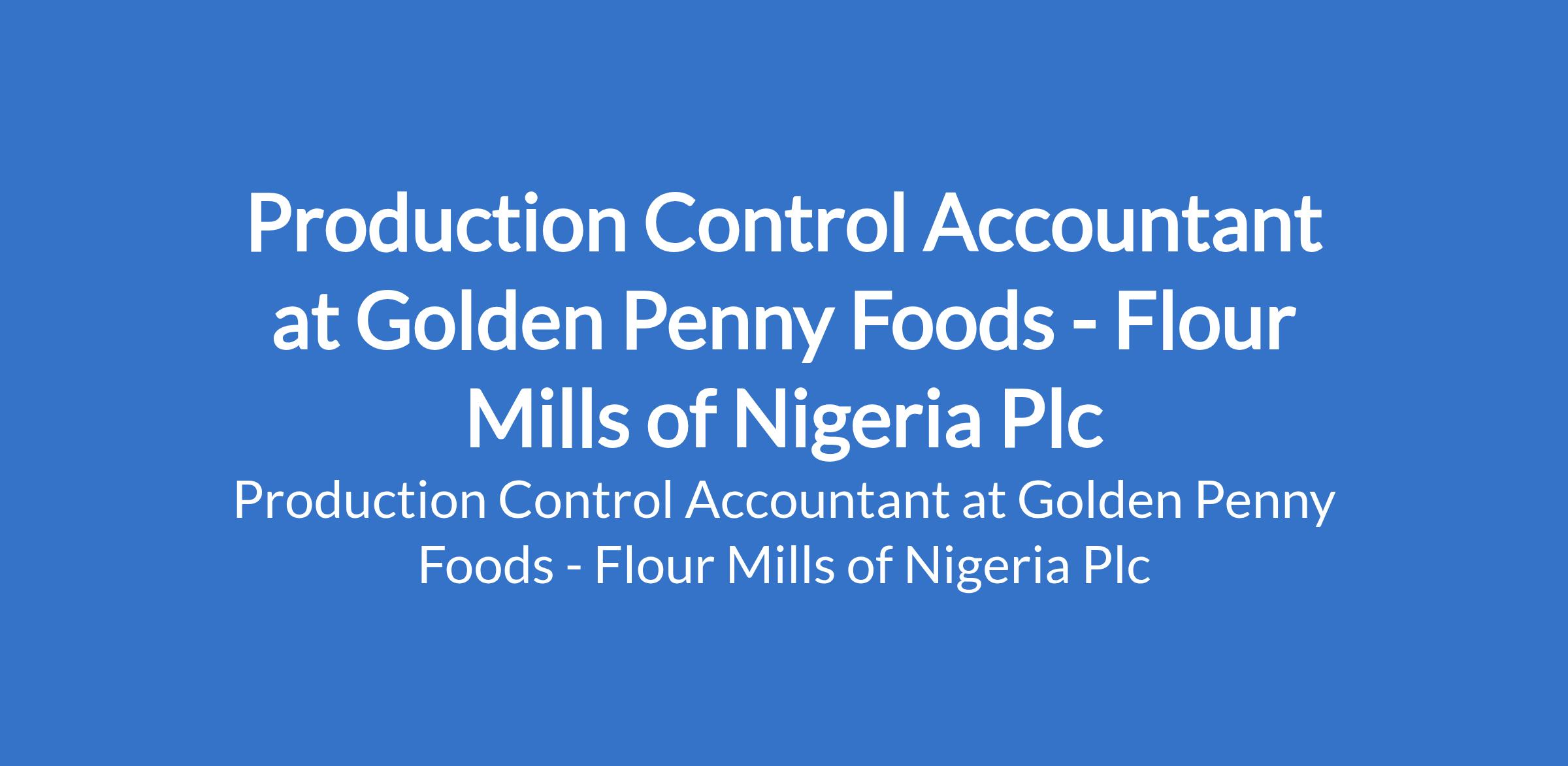 Flour Mills of Nigeria Plc - Our subsidiary, Golden Penny Foods is recruiting to fill the position of: Production Control Accountant. This position is located in Apapa, Lagos State. Interested candidates should possess a B.Sc. / HND in Accounting, Finance, Economics, or related discipline with a minimum of 5 years experience in manufacturing finance, costing, or production finance.