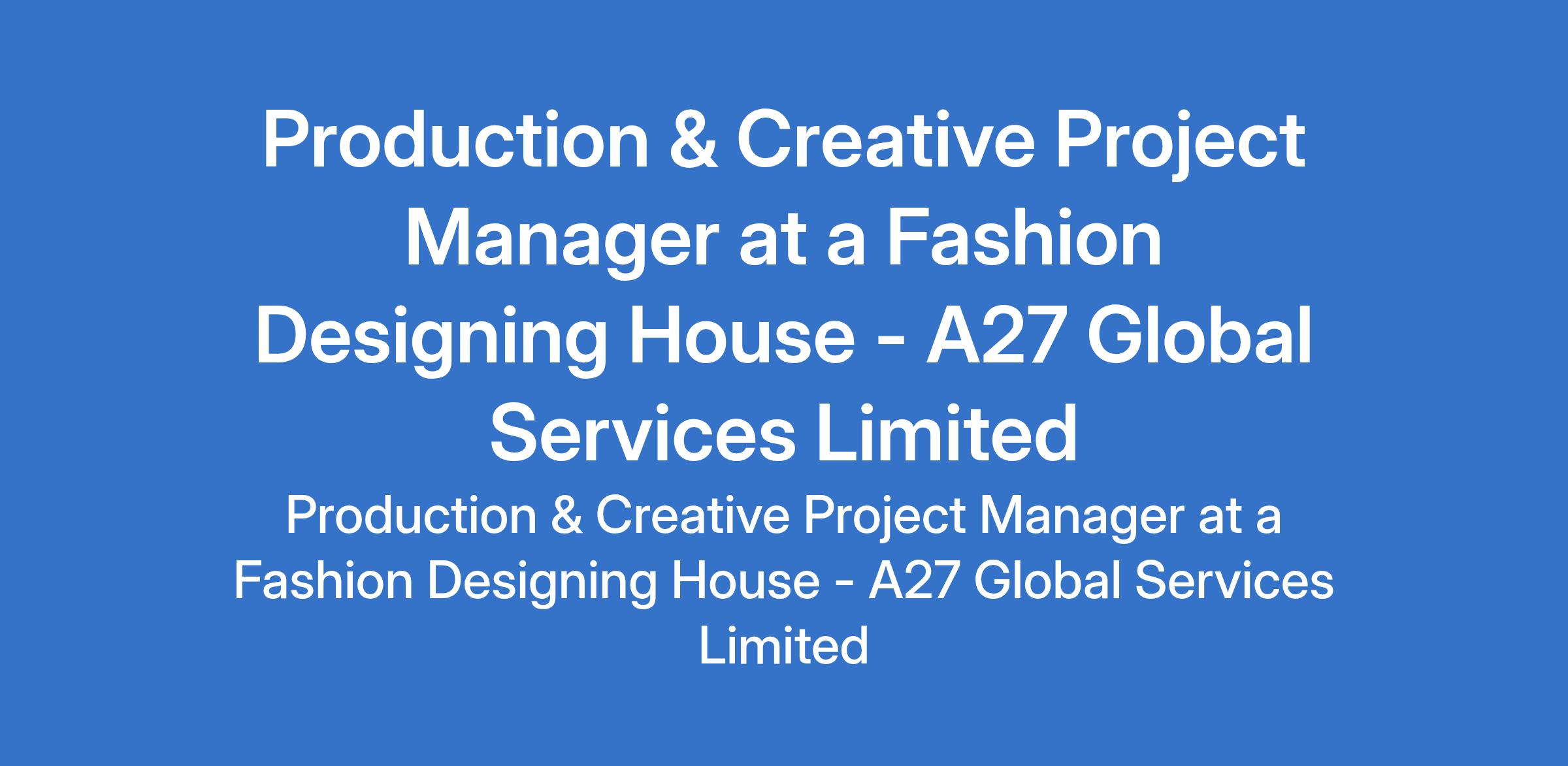 A27 Global Services Limited is recruiting to fill the position of: Production & Creative Project Manager. The position is located in Oniru, Lagos State. Salary: N150,000 Monthly. The role holder will supervise tailors and ensure all garments are produced to high-quality standards. Interested candidates must be Females with experience in a similar role.
